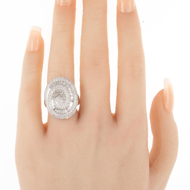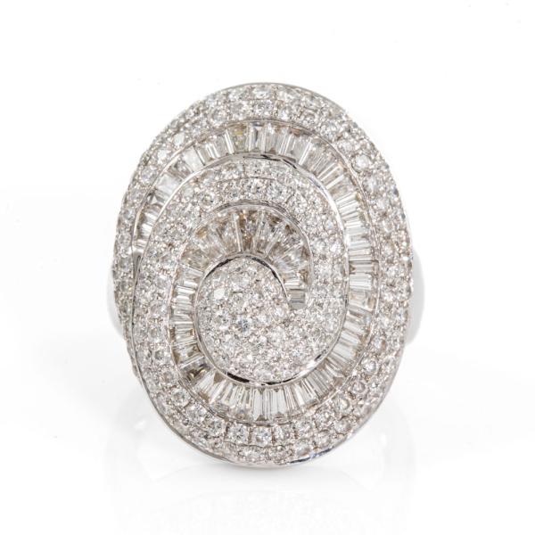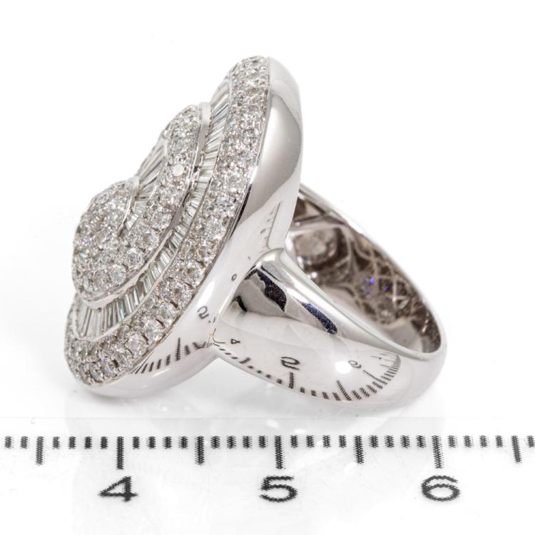 Diamond dress ring with round & baguette cut Natural Diamonds totalling 2.25cts (Estimated grading: H-I SI). 18ct white gold. Ring size K1/2. Band width: 3.5mm-7.2mm. With Receipt dated 04/04/17. Weight: 10.7g. (Pre-owned)