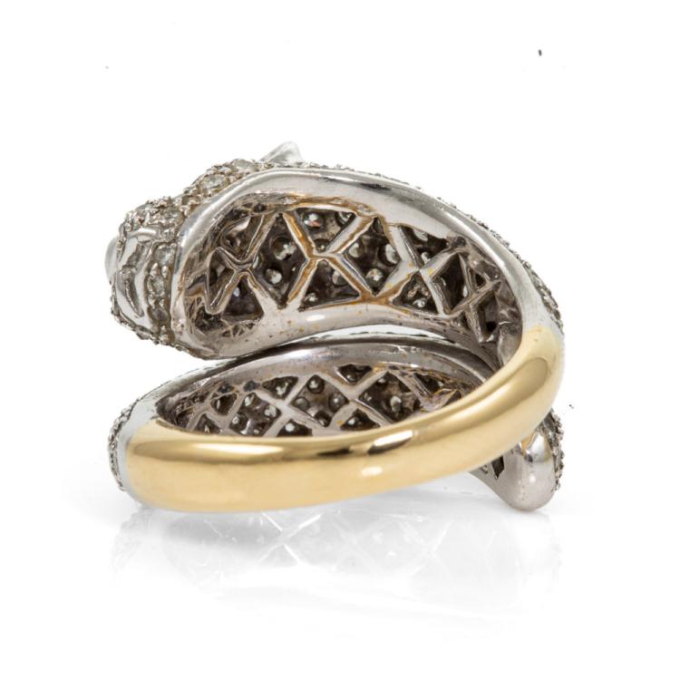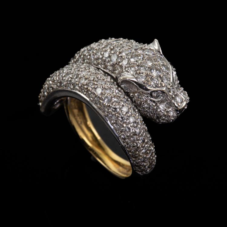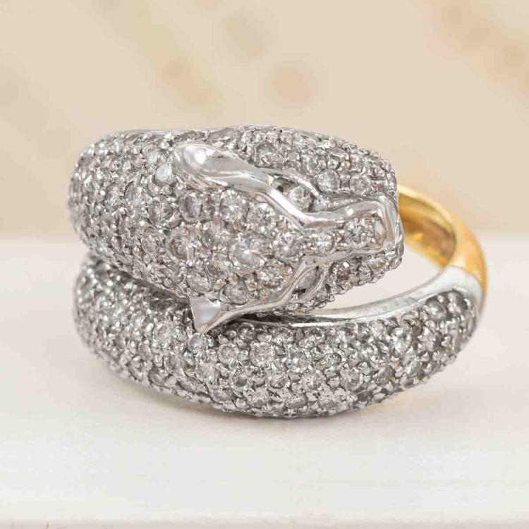 Diamond panther design ring with round Natural Diamonds totalling 2.50cts (Estimated grading: H-I SI). 18ct yellow and white gold. Ring size L. Band width: 4.2mm - 3.5mm. Weight: 13.1g. With Valuation Certificate #418253. (Pre-owned)