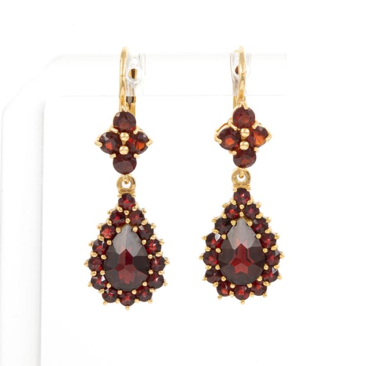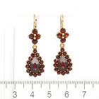 Garnet drop shepherd hook earrings with round & pear shape red Natural Garnet totalling approximately 2.50cts. Drop length: 3.6cm. 18ct yellow gold. Weight: 7.5g. (Pre-owned)