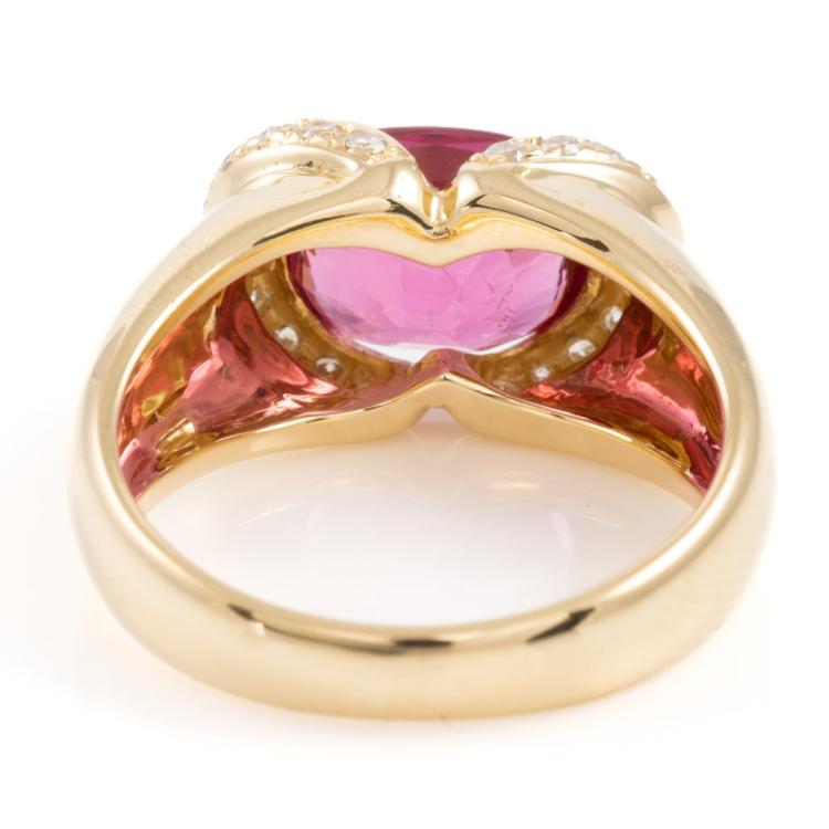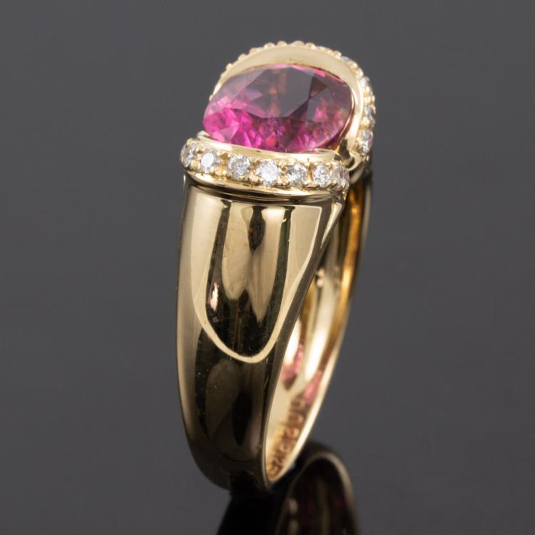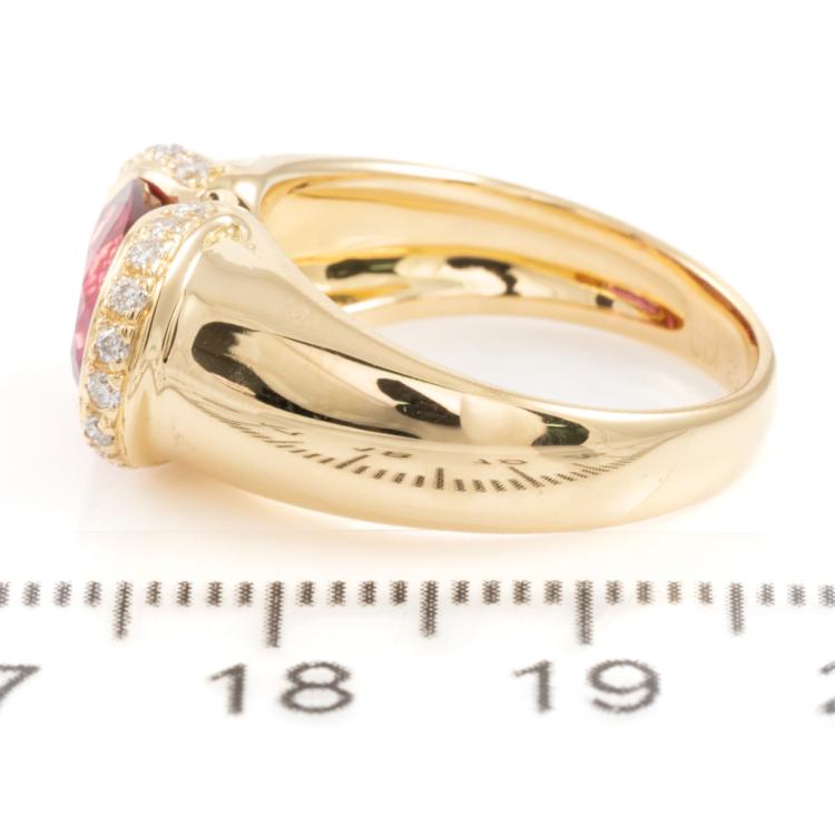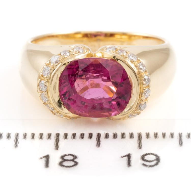 Rubellite and Diamond ring with oval Natural Rubellite of 2.53cts and round Natural Diamonds totalling 0.21cts. 18ct yellow gold. Ring size L. Band width: 5.2mm - 3.1mm. Weight: 7.2g. (Pre-owned)
