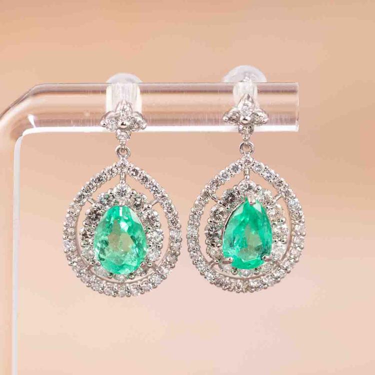 Emerald and Diamond drop earrings with pear shape Natural Emeralds totalling 2.70cts and round Natural Diamonds totalling 1.90s (Estimated grading: I-J SI-P1). Platinum-950 and Platinum-900 with silicon backs. Weight: 7.3g. With Certificate #418137. (Pre-owned)