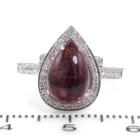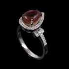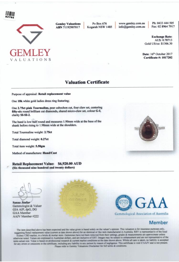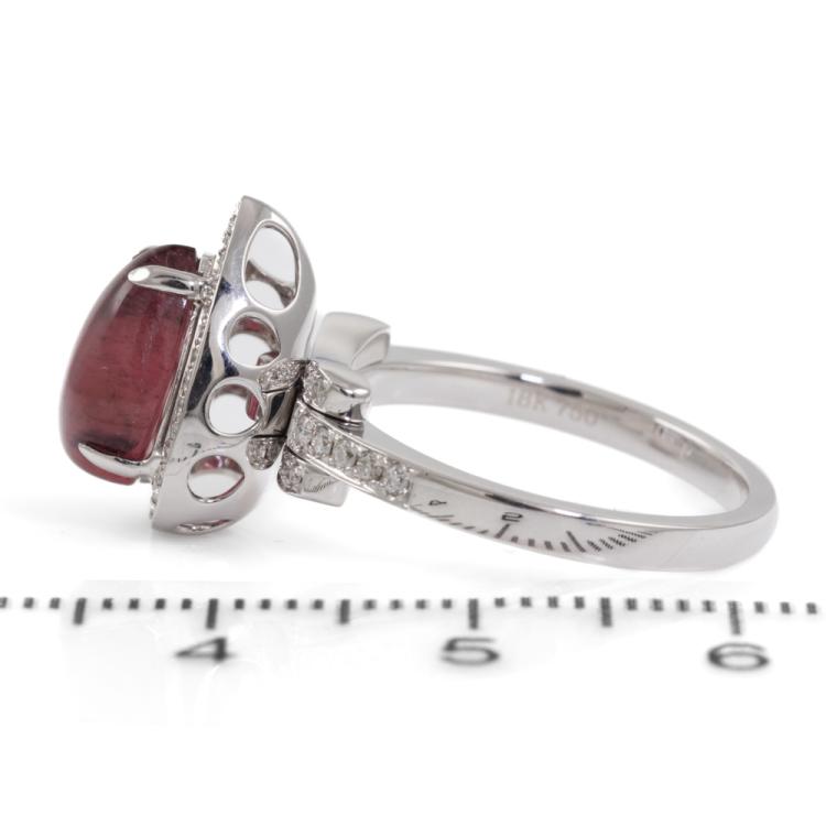 Tourmaline and Diamond ring with pear cabochon cut pink Tourmaline of 2.75ct and round natural Diamonds totalling 0.27ct. 18ct white gold. Ring size: K1/2. Band width: 1.98mm. Weight: 5.58g. With Valuation #1017202. (Pre-Owned)