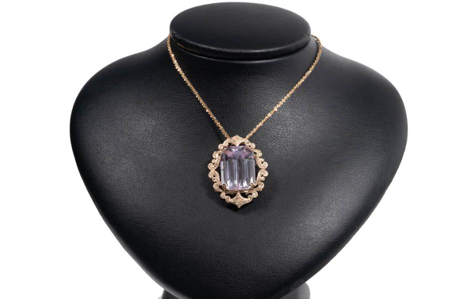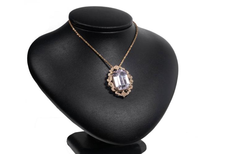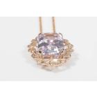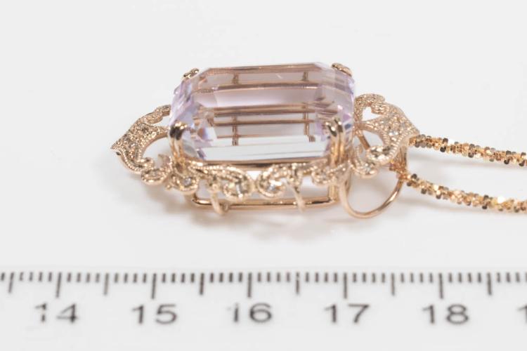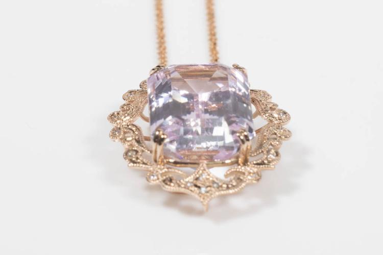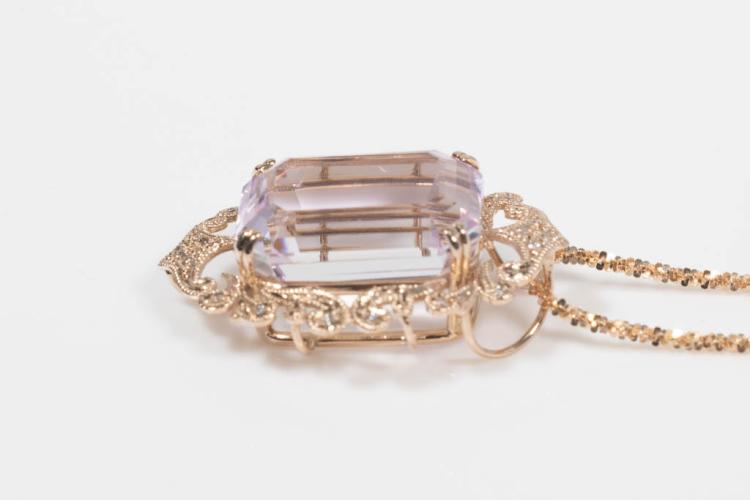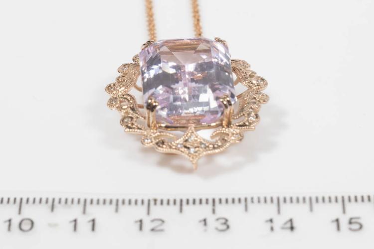 Kunzite and Diamond pendant with emerald cut natural Kunzite of 28.26ct and round natural Diamonds totalling 0.13cts. 18ct rose gold with 18ct rose gold adjustable 46cm chain. Weight: 15.1g. (Pre-owned)