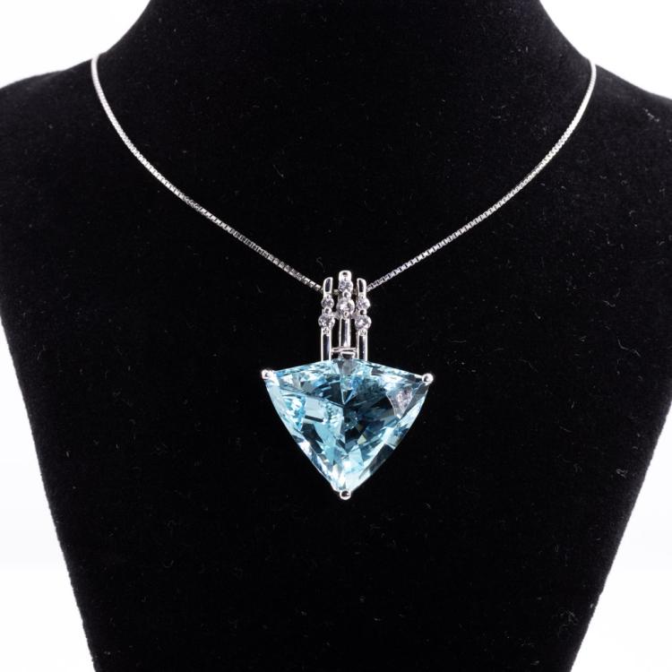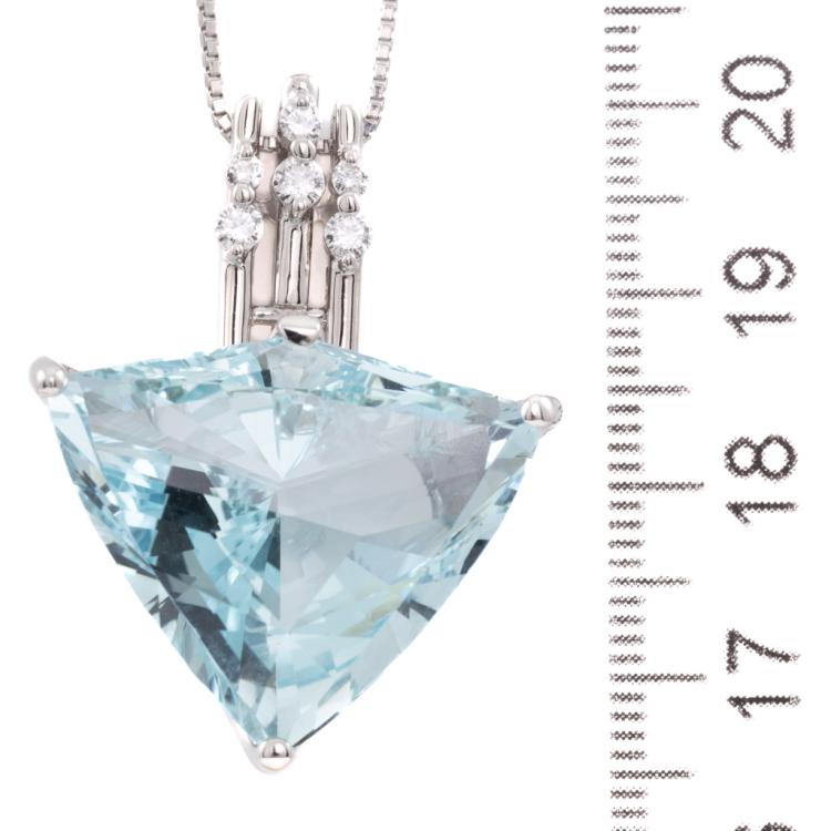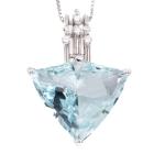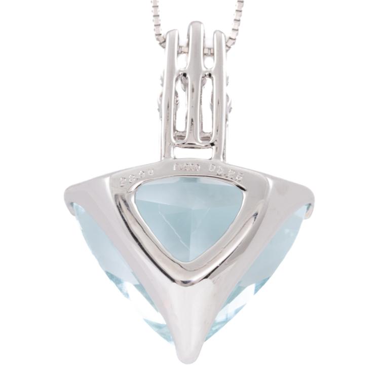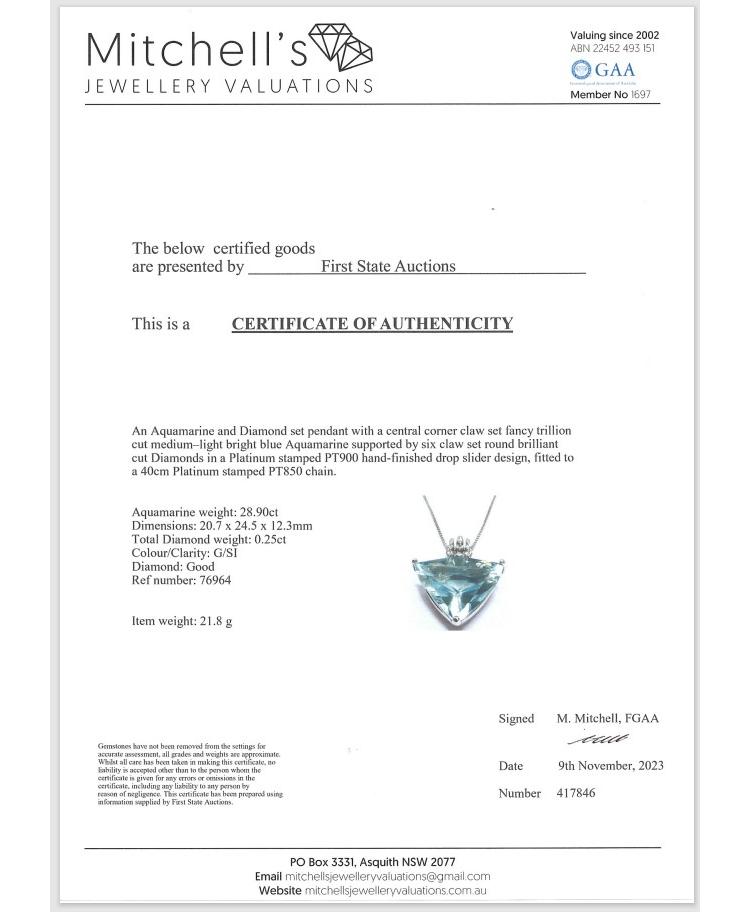 Aquamarine and Diamond Pendant with fancy trilliant cut Natural Aquamarine of 28.90ct and round Natural Diamonds totalling 0.25ct (Estimated grading: G SI). Platinum 900 with Platinum 850 max 40cm chain. Weight: 21.8g. With Certificate #417846. (Pre-owned)