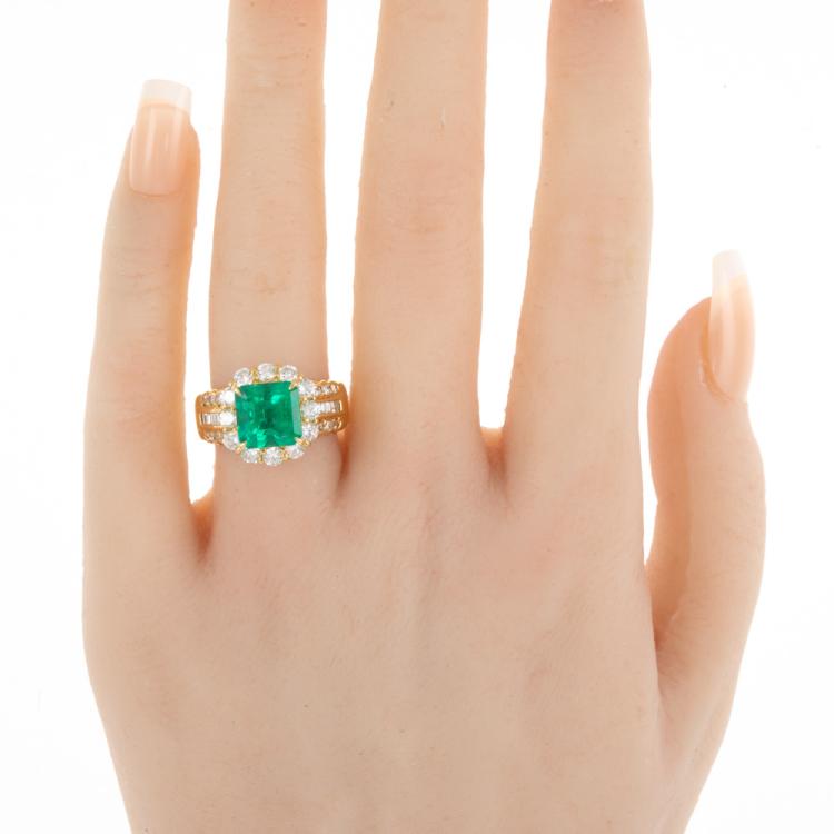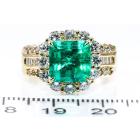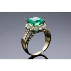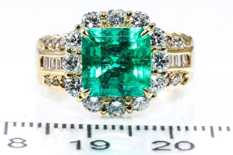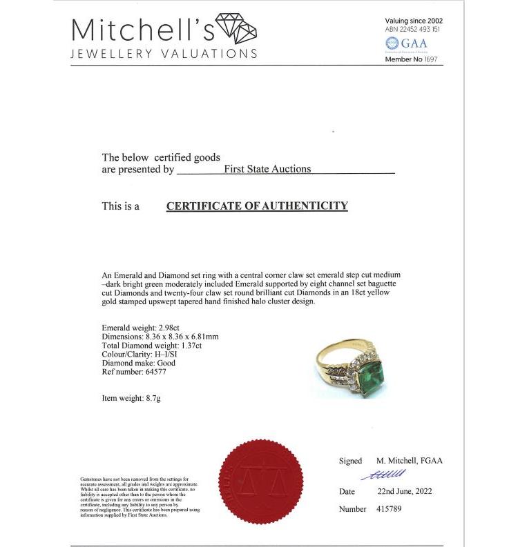 Emerald and Diamond ring with an emerald cut Natural Emerald of 2.98ct and round & baguette cut Natural Diamonds totalling 1.37cts (Estimated grading: H-I SI). 18ct yellow gold. Ring size L1/2 - ring resizing is not recommended. Weight: 8.7g. With Certificate #64577. (Pre-owned)