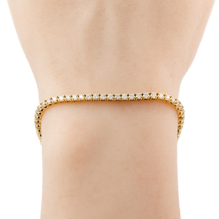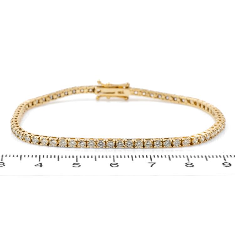 Diamond tennis bracelet with 69 round brilliant cut Natural Diamonds totalling 3.11cts. (Estimated grading: I-J SI.) 18ct yellow gold. Length: 18cm. Weight: 8.6g. With Valuation Certificate #417978. (New)