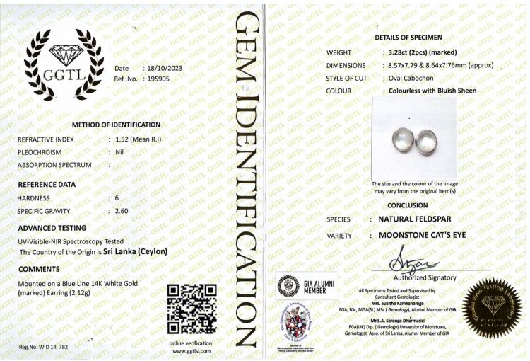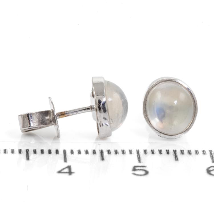 Moonstone stud earrings with oval cabochon cut Ceylon Natural Moonstone totalling 3.28ct. 14ct white gold. Weight: 2.1g. With GGTL report #195905. (As new) ^