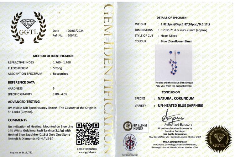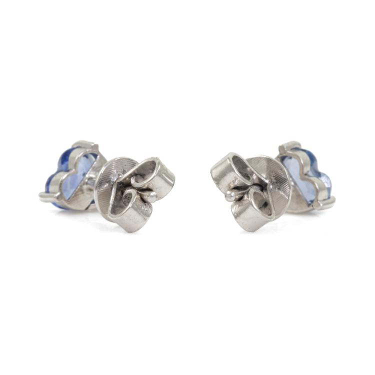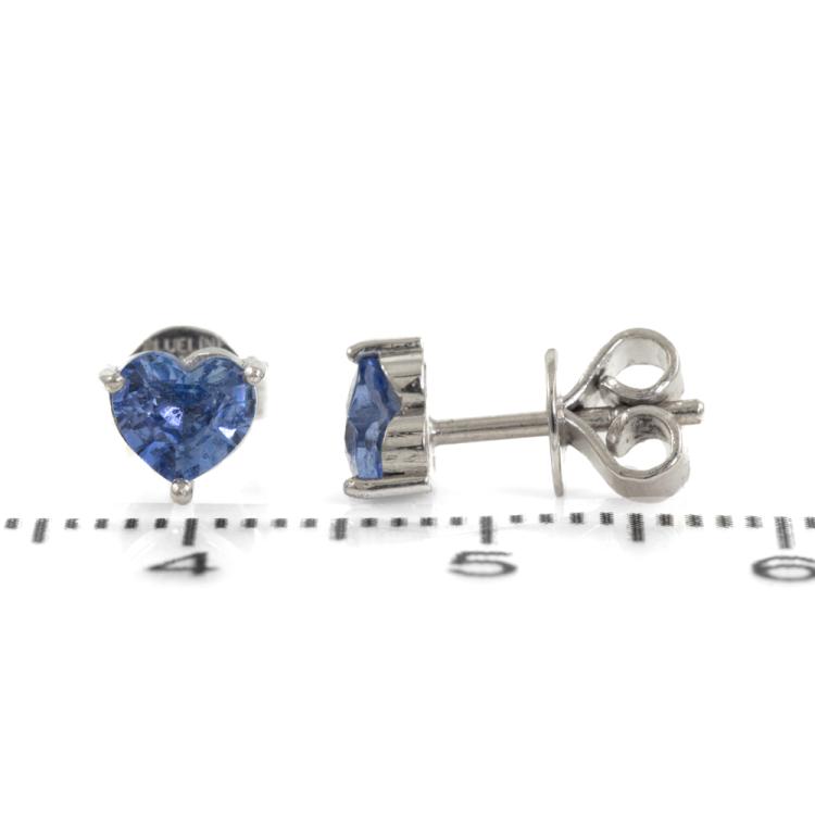 Sapphire and Diamond stud earrings with a detachable drop feature (length: 8.5cm). 2 heart shape natural unheated Ceylon blue Sapphires totalling 1.82ct, 10 heart shape Ceylon natural blue Sapphire totalling 1.87ct and round natural Diamonds totalling 0.17ct. 14ct white gold. Weight: 3.1g. With GGTL Report #209451. (As new)