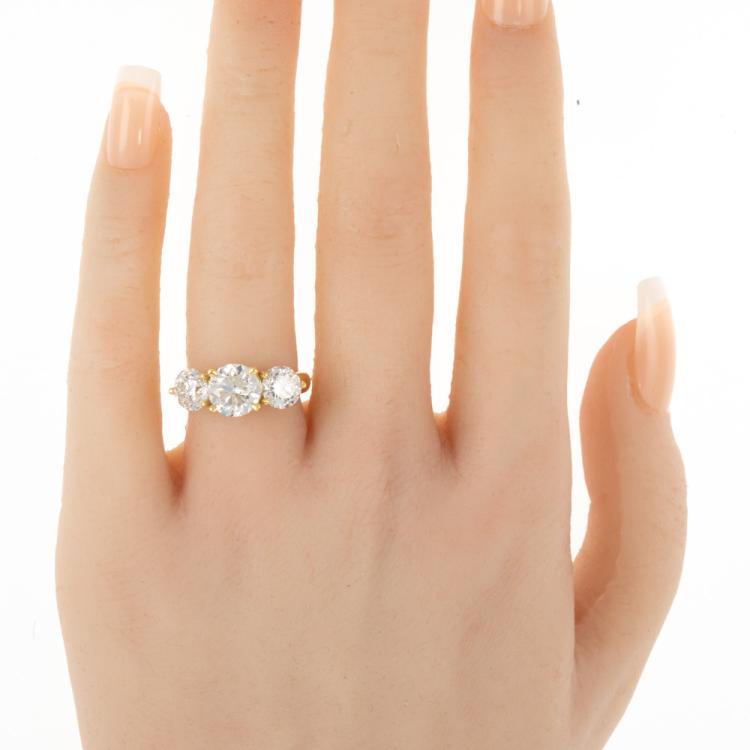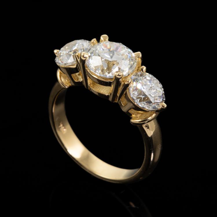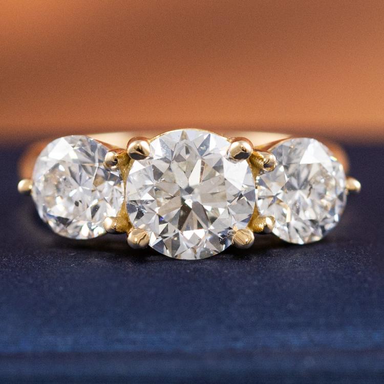 Diamond trilogy ring with centre round Natural Diamond of 2.01ct (with GIA Report graded as H P1 #1448625851) and 2 side round Natural Diamonds totalling 2.00cts (with GIA Reports graded as G P1 #6465848929, 1445292410). 18ct yellow gold. Ring size: L. Band width: 3.5mm - 3mm. Weight: 6.9. With Valuation Certificate #418430. (New)