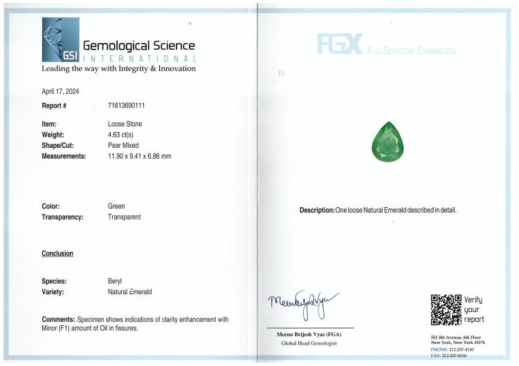A loose pear shape natural Emerald of 4.63ct (with GSI Report #71613690111). (As new)