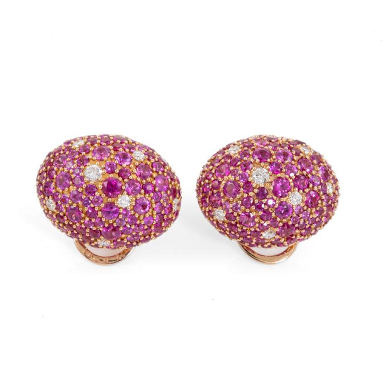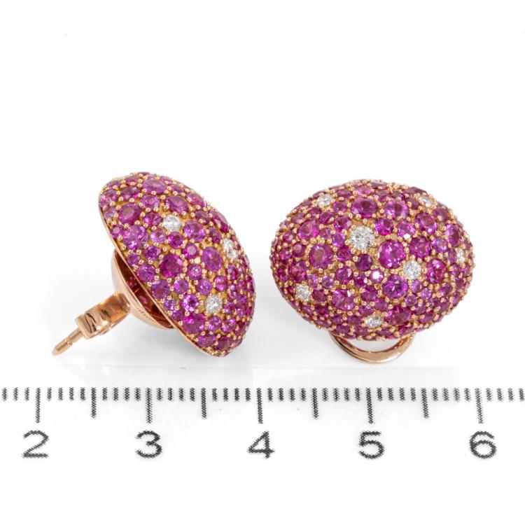 Sapphire and Diamond earrings with round pink Natural Sapphires totalling 5.12cts and round Natural Diamonds totalling 0.36cts (Estimated grading: H SI). 18ct rose gold. Weight: 10.2g. (Pre-owned)