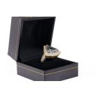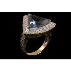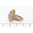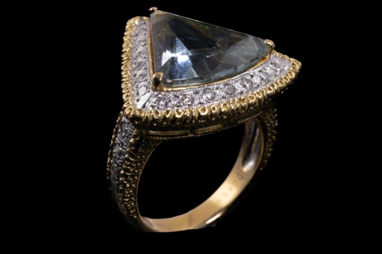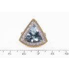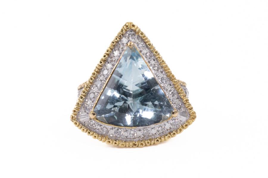 Aquamarine and Diamond ring with trilliant cut Natural Aquamarine of 5.38ct - with a minor surface inclusion on crown facet) and round Natural Diamonds totalling 0.40ct (Estimated grading: H SI). 18ct yellow gold. Ring size K. Weight: 10.8g. (Pre-owned)