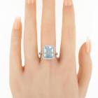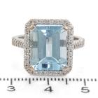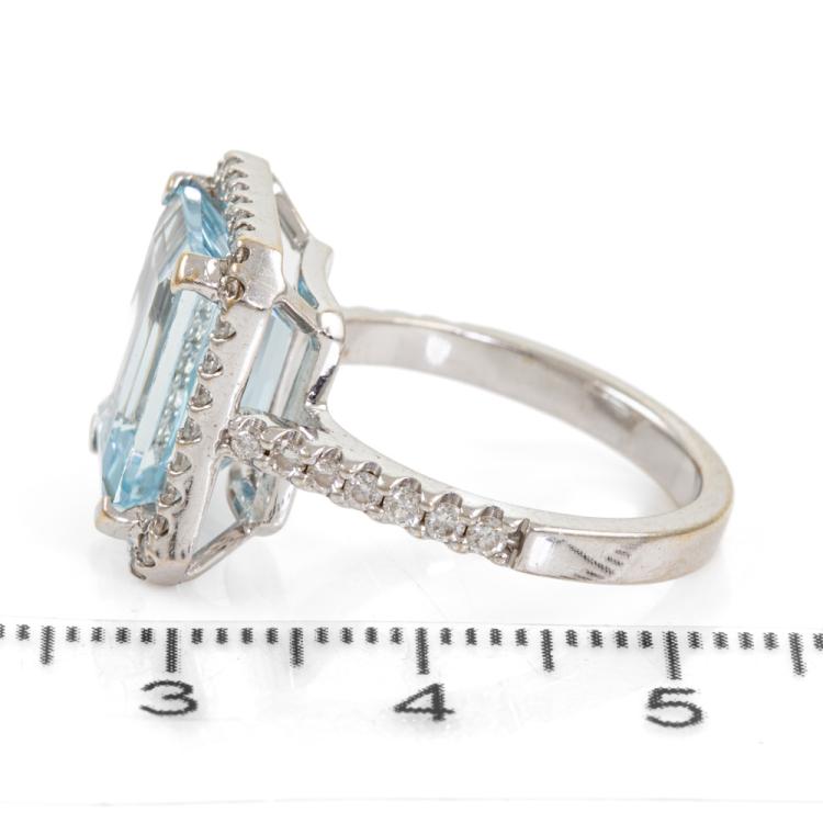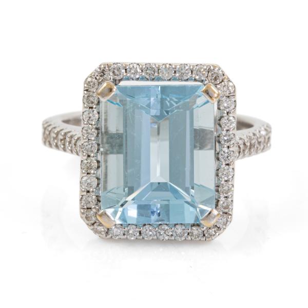 Aquamarine and Diamond ring with an emerald cut natural Aquamarine of 5.43ct and round natural Diamonds totalling 0.67cts (Estimated grading: HIJ SI). 18ct white gold. Ring size N. Band width: 2.7m. Weight: 6.9g. (Pre-owned, note rhodium plating slightly faded on back of band)
