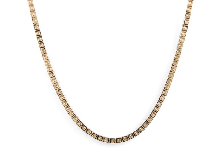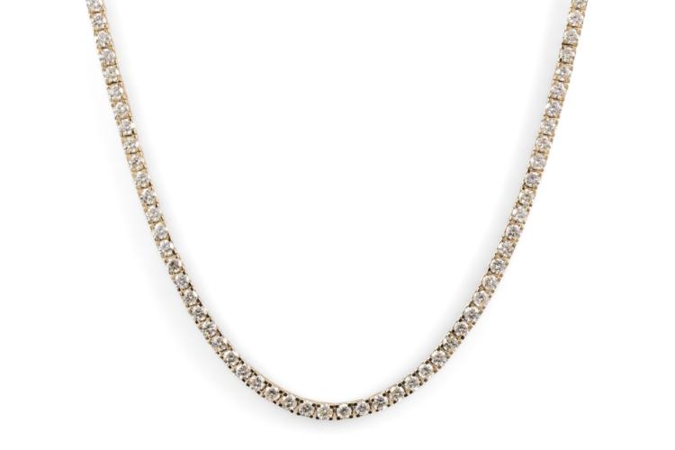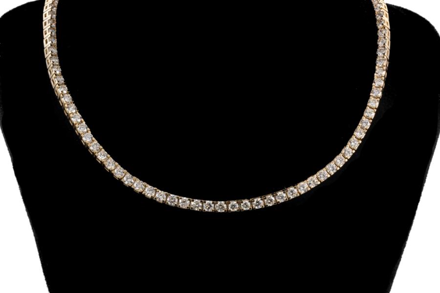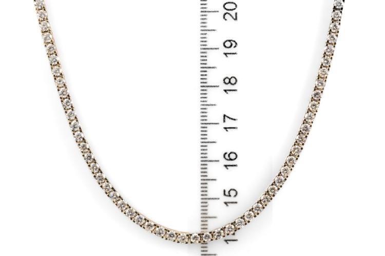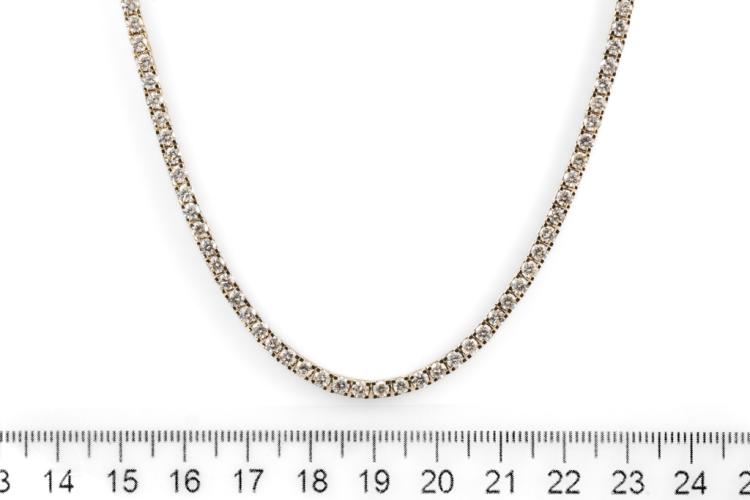Diamond tennis necklace with 81 round shape Natural Diamonds totalling 5.70cts (Estimated grading: H-I SI-P1). 14ct yellow gold. Length: 42cm. Diamonds extend 24.5cm of the length. Width: 2.9mm. Weight: 22.3g. With Valuation Certificate #417736. (New)