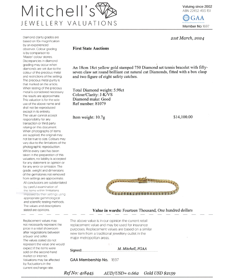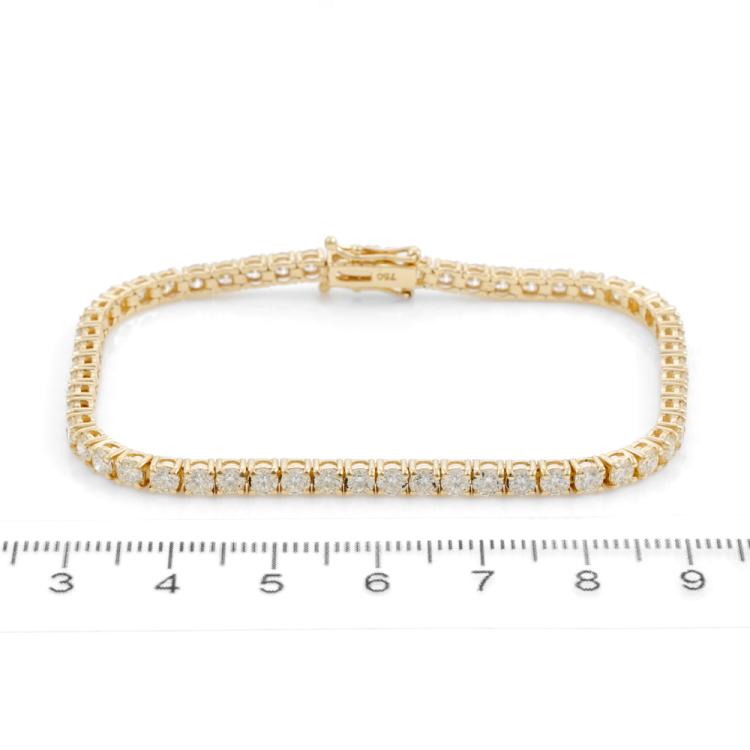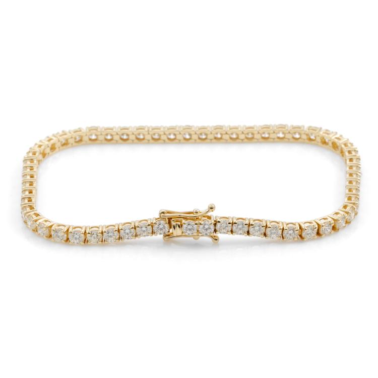 Diamond tennis bracelet with 57 round brilliant cut Natural Diamonds totalling 5.98ct (Estimated grading: J-K VS). 18ct yellow gold. Length: 18cm. Weight: 10.7g. With Valuation Certificate #418445. (New)