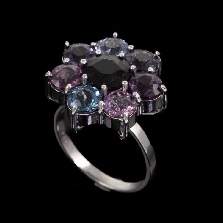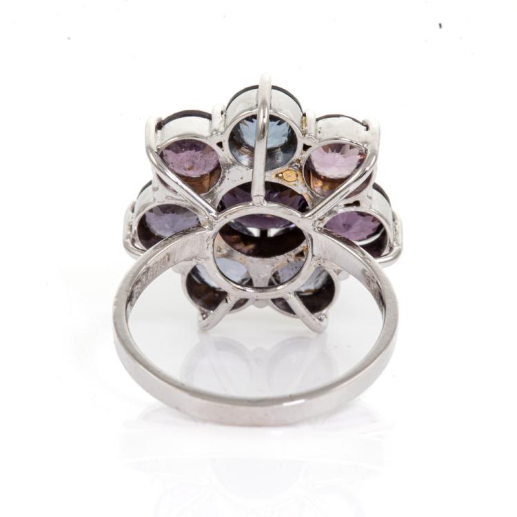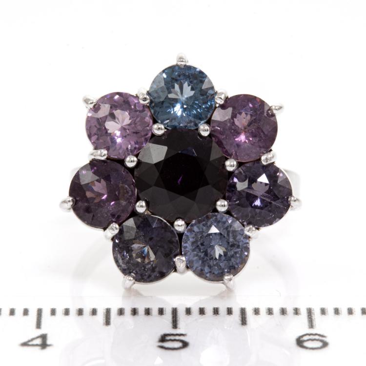 Spinel ring with 8 round multi-colour Ceylon Natural Spinel totalling 6.00cts. 14ct white gold. Ring size K. Band width: 1.9mm. Weight: 4.8g. With GGTL report #200891. (As new)^
