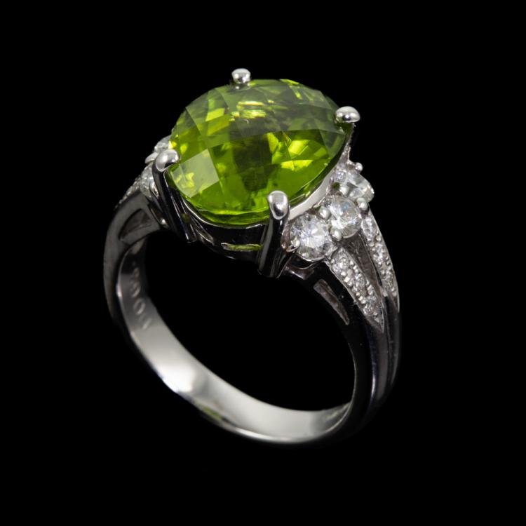 Peridot and Diamond ring with oval Natural Peridot of 6.24ct and round Natural Diamonds totalling 0.63cts (Estimated grading: H-I SI). 18ct white gold. Ring size L1/2. Band width: 4.2mm - 3.2mm. Weight: 7.8g. (Pre-owned)