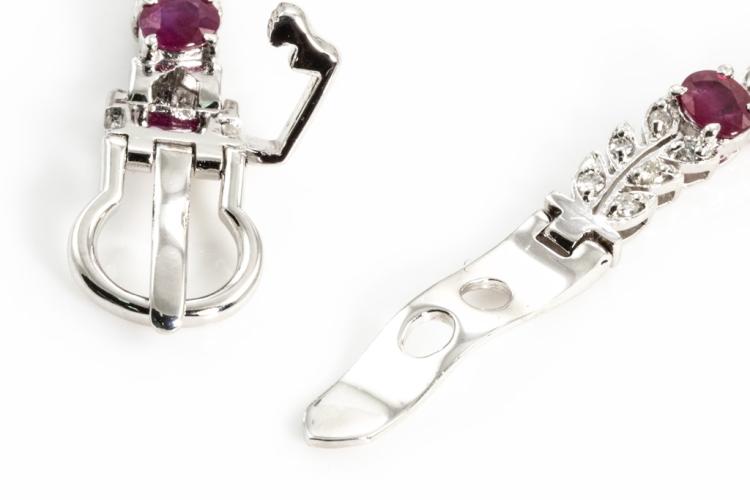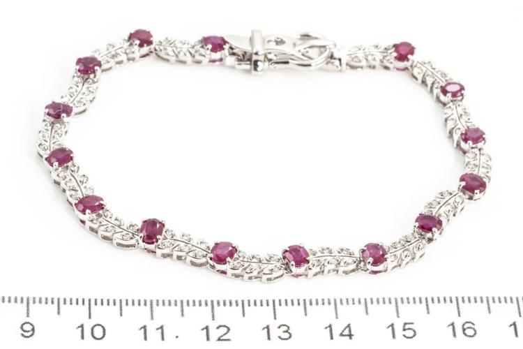 Ruby and Diamond bracelet with oval Rubies totalling 6.32cts and round Diamonds totalling 1.25cts (Estimated grading: K-L P1-P2). 18ct white gold with buckle design closure. Length: 22cm. Weight: 19.3g. With certificate #415856. (Pre-owned)