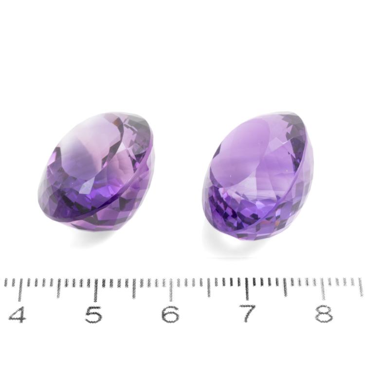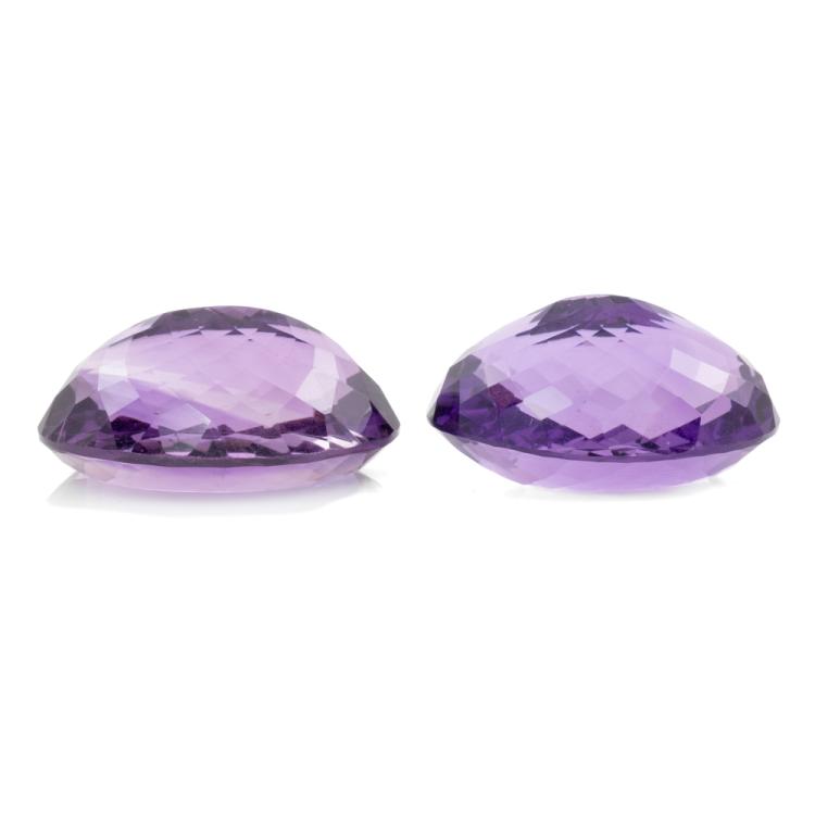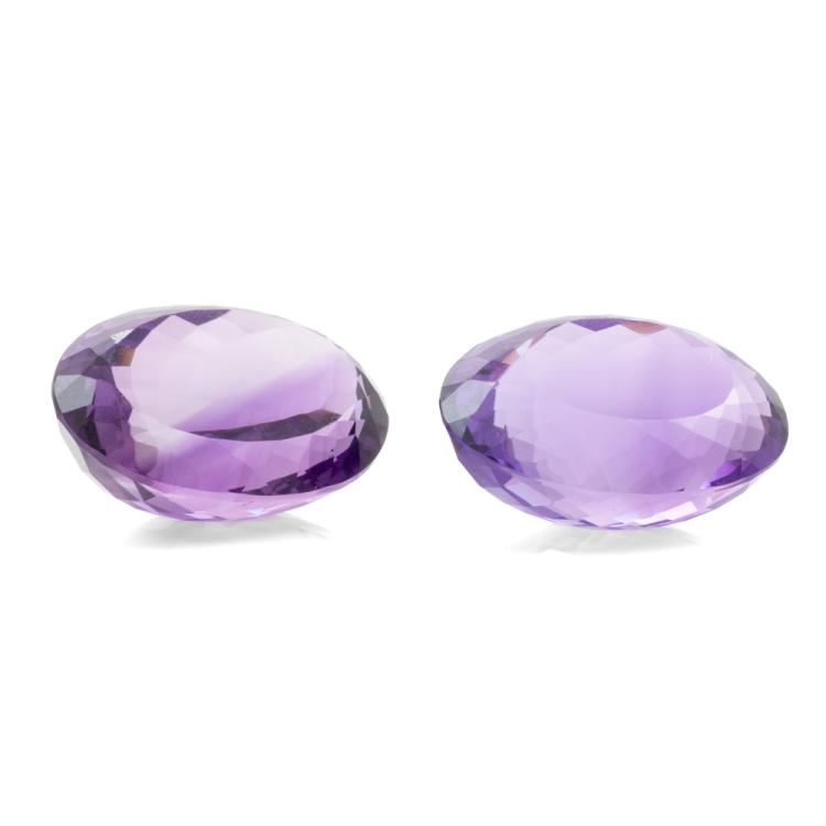 A pair of Loose oval shape natural Amethyst totalling 63.92ct. Approximately sizes: 23.90mm x 17.39mm x 13.08mm and 24.58mm x 17.70mm x 11.48mm). (New)^