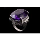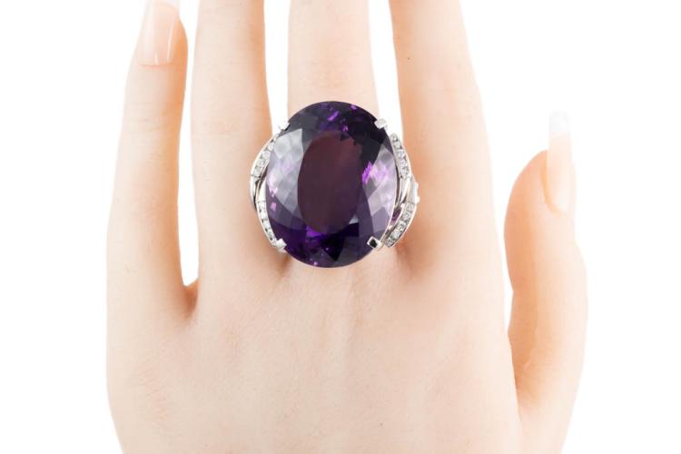 Amethyst and Diamond ring with oval shape Natural Amethyst of 75.95ct and round Natural Diamonds totalling 0.37ct (Estimated grading: G-H SI). Platinum-900. Ring size K - ring resizing is not recommended. Band width: 7.7mm - 4.5mm. Weight 38.1g. With certificate #417668 (Pre-owned)