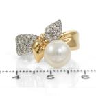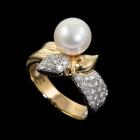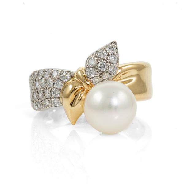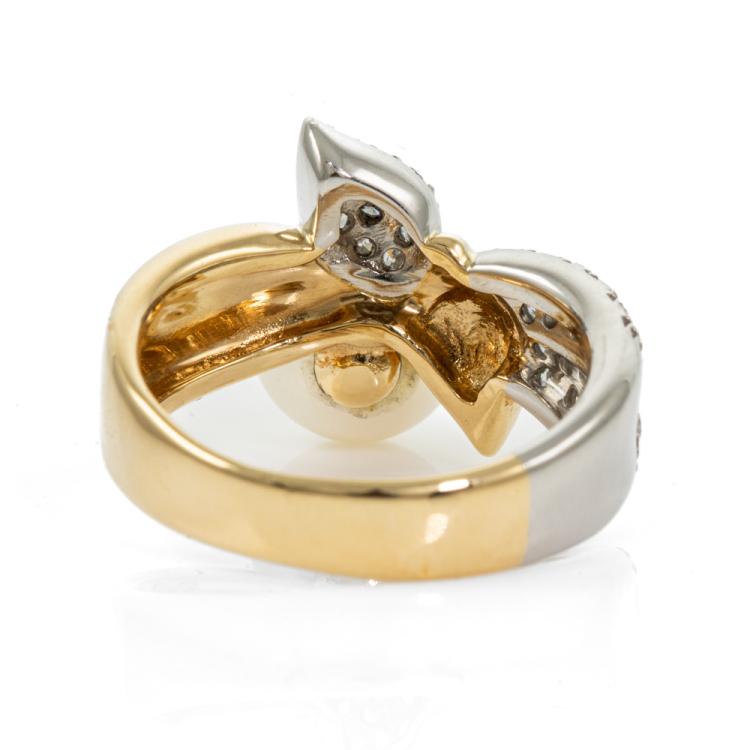Pearl and Diamond bow design ring with Akoya Pearl of 8.3mm and round Natural Diamonds totalling 0.33cts (Estimated grading: G-H VS-SI). 18ct yellow gold and platinum 900. Ring size K. Band width: 6mm - 3.6mm. Weight: 7.1g. (Pre-owned)