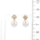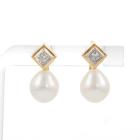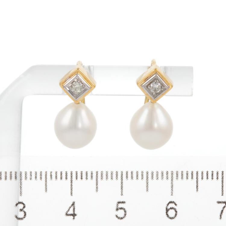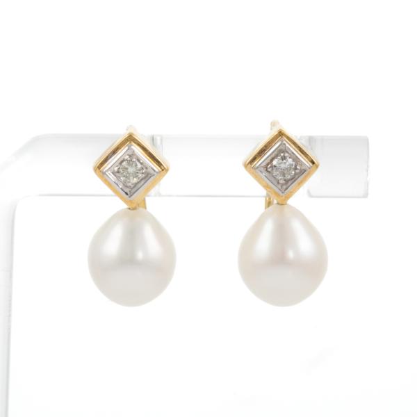 Pearl and Diamond shepherds hook earrings with 2 drop shape cultured pearls of 8.5mm-8.6mm and round natural Diamonds totalling approximately 0.10cts. 18ct yellow & white gold. Weight: 4.7g. (Pre-owned)