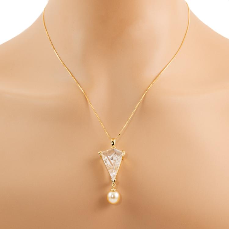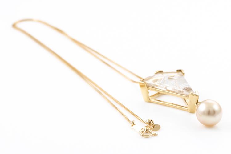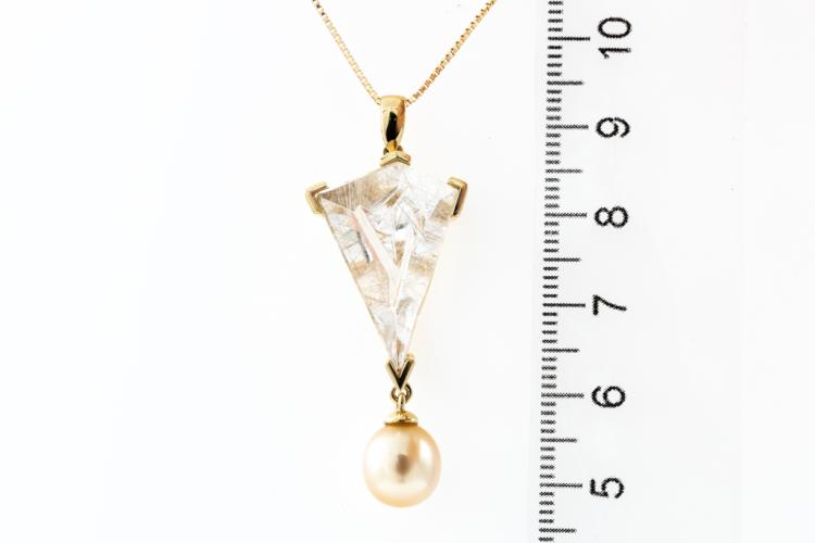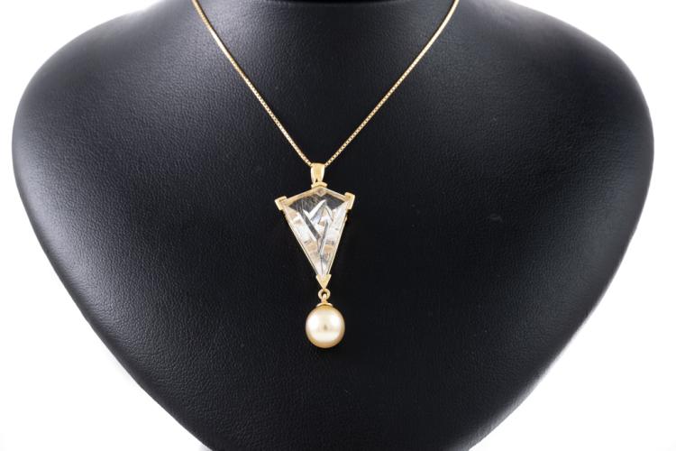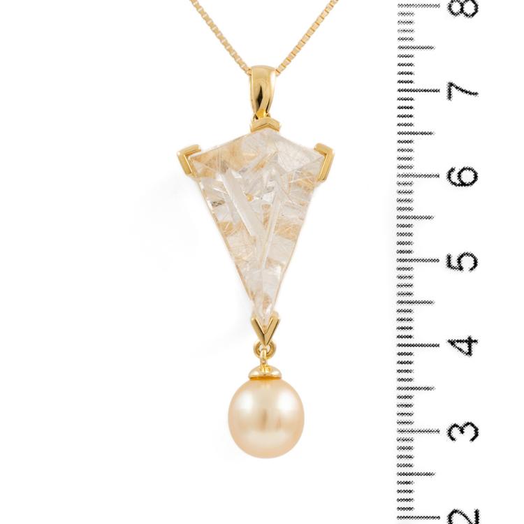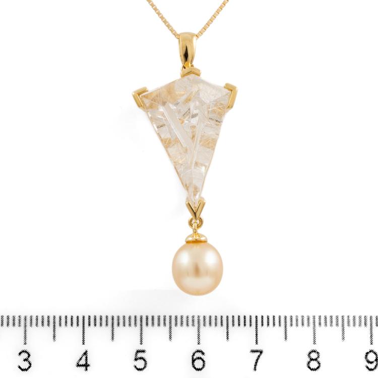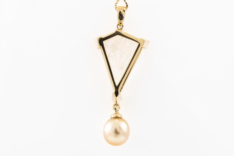 Pearl and Quartz pendant with Golden South Sea Pearl of 8.7mm and rutilated Natural Quartz of 8.03ct. 18ct yellow gold with 18ct yellow gold adjustable 44cm chain. Weight: 9.2g. (Pre-owned)6