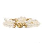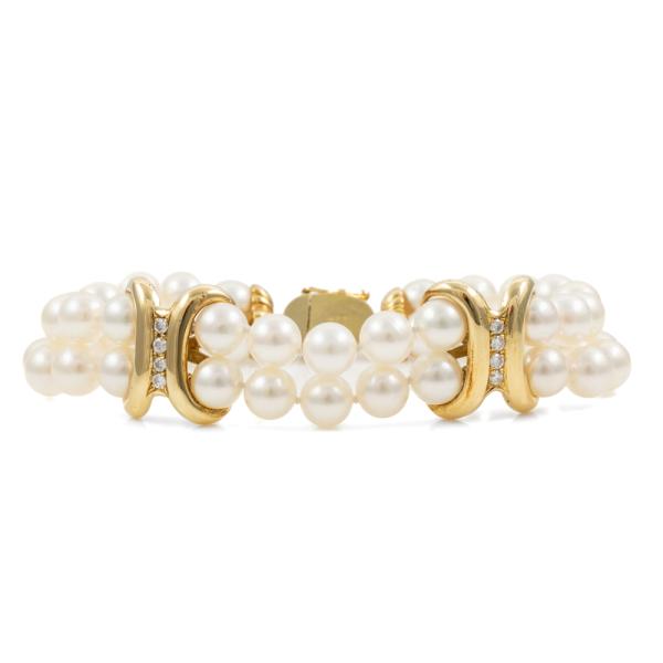 Pearl and Diamond bracelet with 2 rows white Akoya Pearl of 6.8mm-6.5mm and 8 round natural Diamonds totalling approximately 0.16cts. 18ct yellow gold. Length: 17.5cm. Weight: 30.2g. (Pre-owned)