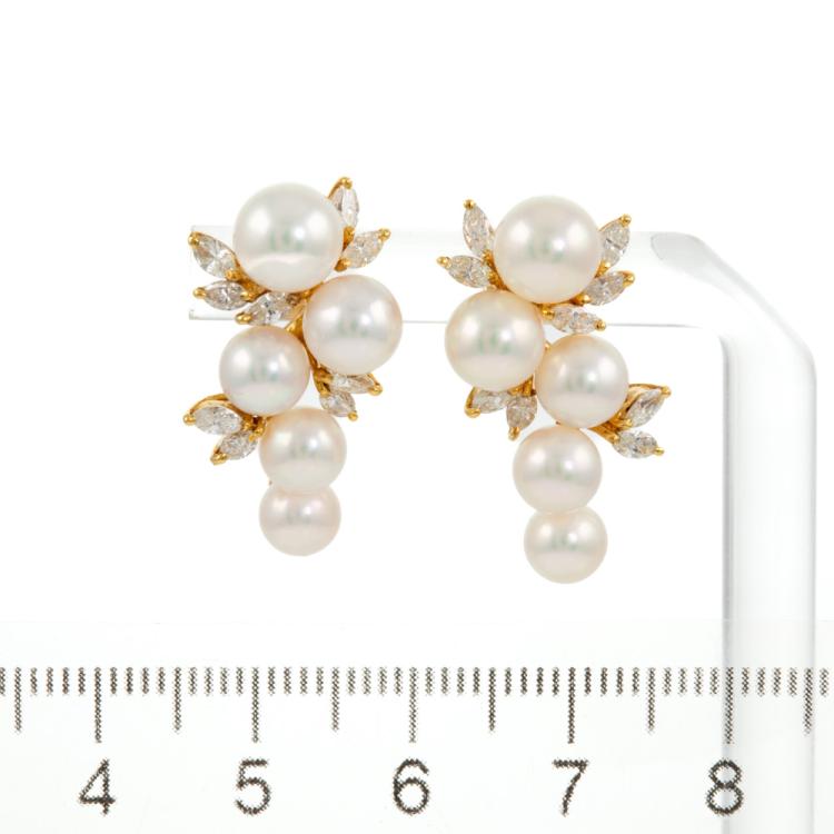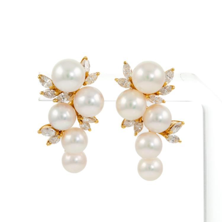 Pearl and Diamond earrings with Akoya Pearls of 5.3mm-6.7mm and marquise cut natural Diamonds totalling 0.72cts (Estimated grading: I-J SI). 18ct yellow gold. Weight: 7.0g. (Pre-owned)