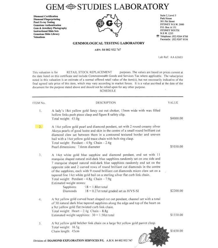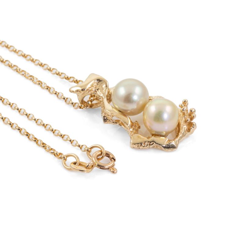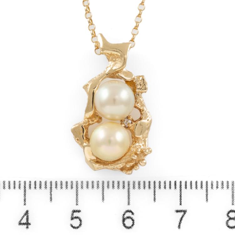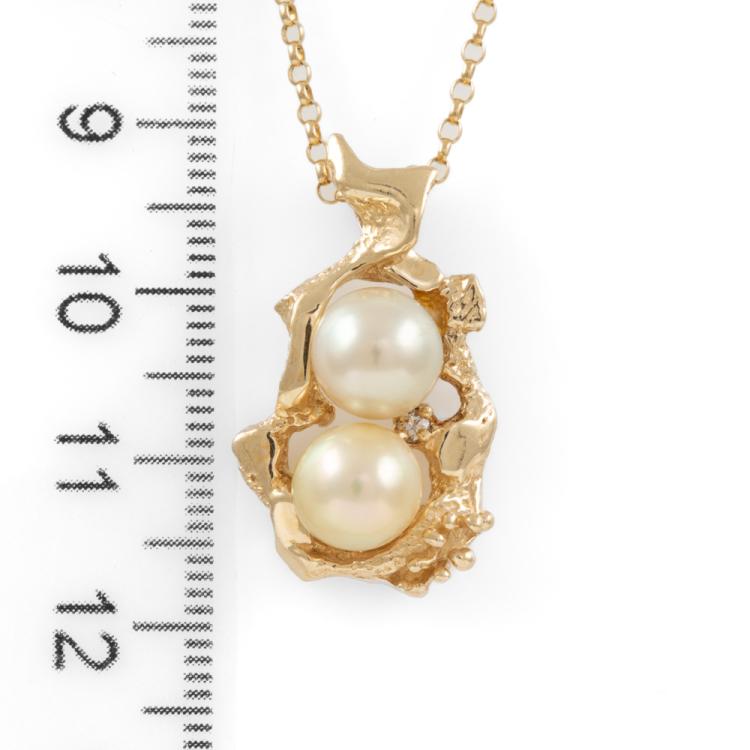 Pearl and Diamond pendant with 2 Akoya pearls of 7.6mm and round Natural Diamond of approximately 0.02ct. 14ct yellow gold with 14ct yellow gold 50cm chain. Weight: 7.5g. With copy of GSL Valuation #AA 63603, item 2. (Pre-owned)^