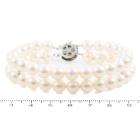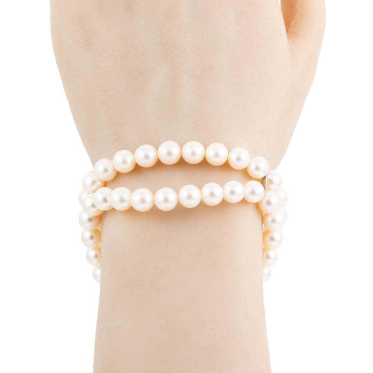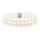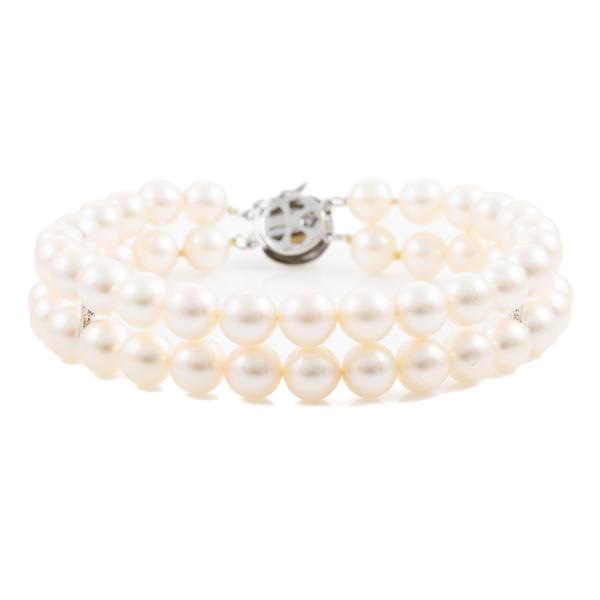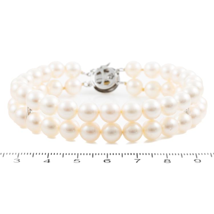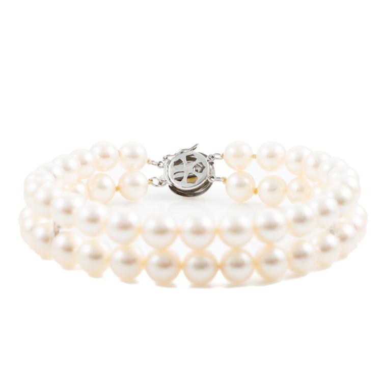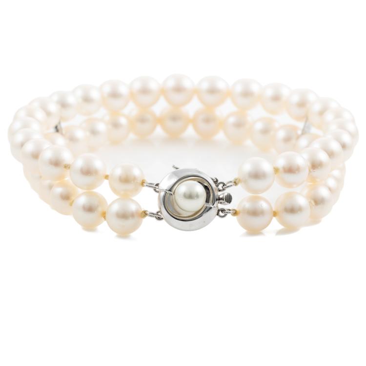 Akoya Pearl bracelet with 2 rows Akoya Pearls of 7.1 - 7.6mm. Clasp: 14ct white gold with 5.9mm Akoya Pearl on clasp. Length: 19.5cm. Weight: 29.1g. (Pre-owned)