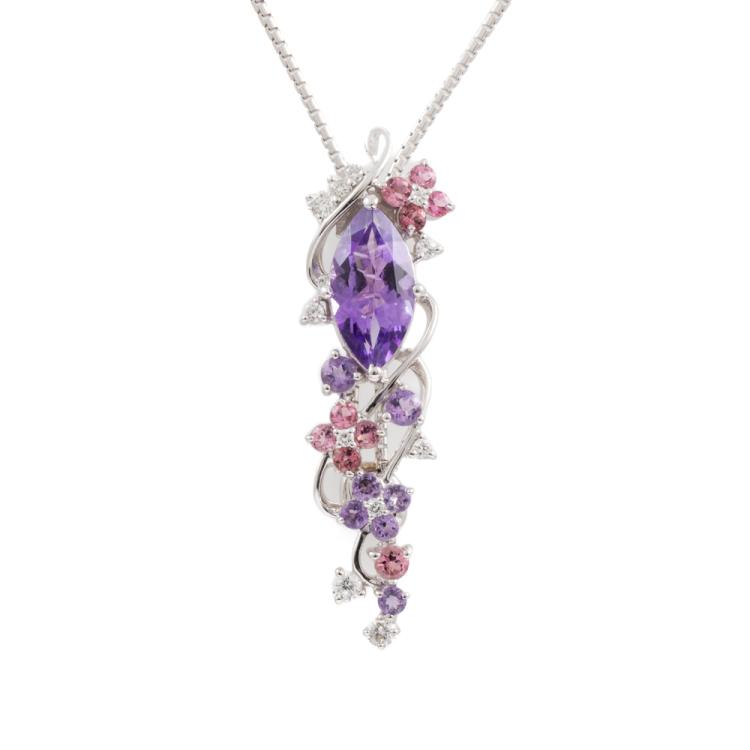Amethyst, Tourmaline, & Diamond lariat pendant with round & marquise cut Natural Amethysts totalling 1.31cts, round pink Natural Tourmaline totalling 0.20cts, and round Natural Diamonds totalling 0.14cts. 18ct white gold with 18ct white gold 76cm adjustable chain. Weight: 9.2g. (Pre-owned)