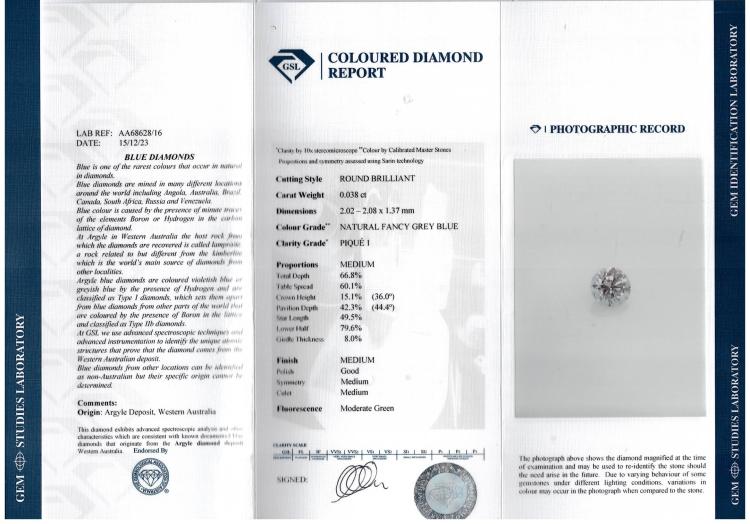 A loose round brilliant cut Argyle Natural Diamonds totalling 0.038ct (With GSL Report graded as Natural Fancy Grey Blue P1 #AA68628/16) Origin: Argyle Deposit, Western Australia. (As New)