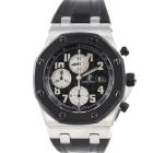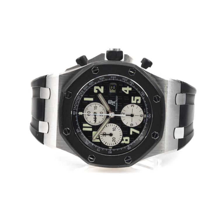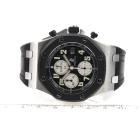 Audemars Piguet Royal Oak Offshore stainless steel automatic mens watch. Black chronograph dial, date, case diameter: 42mm, adjustable strap length: 19.5cm, Swiss made. Ref# 25940SK.00.D002CA.01.A. With Audemars Piguet black rubber strap and clasp. With Certificate of Authenticity. 3 month FSA warranty (Pre-owned)