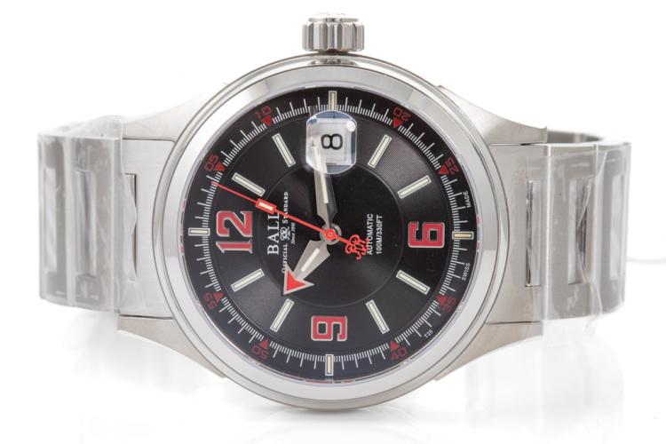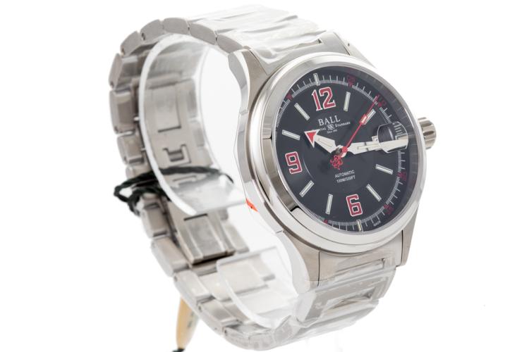Ball Fireman Racer stainless steel automatic mens watch. Black dial, date, case diameter: 40mm, wrist size: 19cm, Swiss made. Ref# NM2088C-S2J-BKRD. With Ball stainless steel bracelet and clasp. With Ball Premium International Warranty Certificate and Ball box. 12 month FSA warranty (As new, Note: case and bracelet on original wrapping)