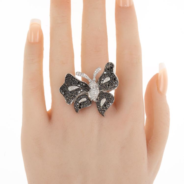 Diamond butterfly design ring with round Natural black and white Diamonds totalling approximately 2.97 (Estimated grading for white Diamonds: I-J P1. Note: black Diamond may be treated). 18ct white gold. Ring size N1/2. Band width: 2.3mm - 4.1mm. Weight: 11.8g. (Pre-owned)