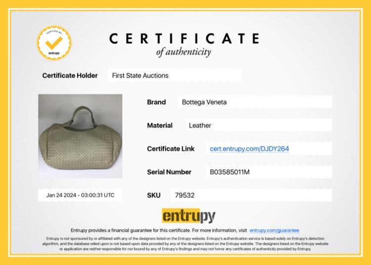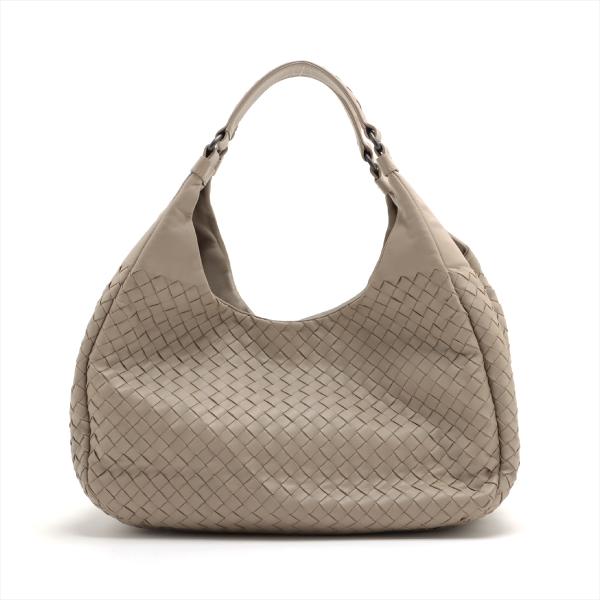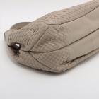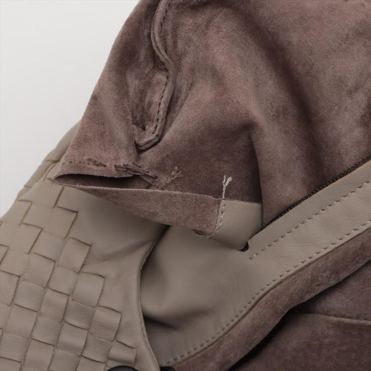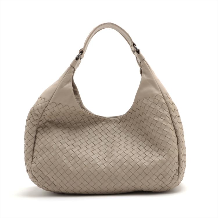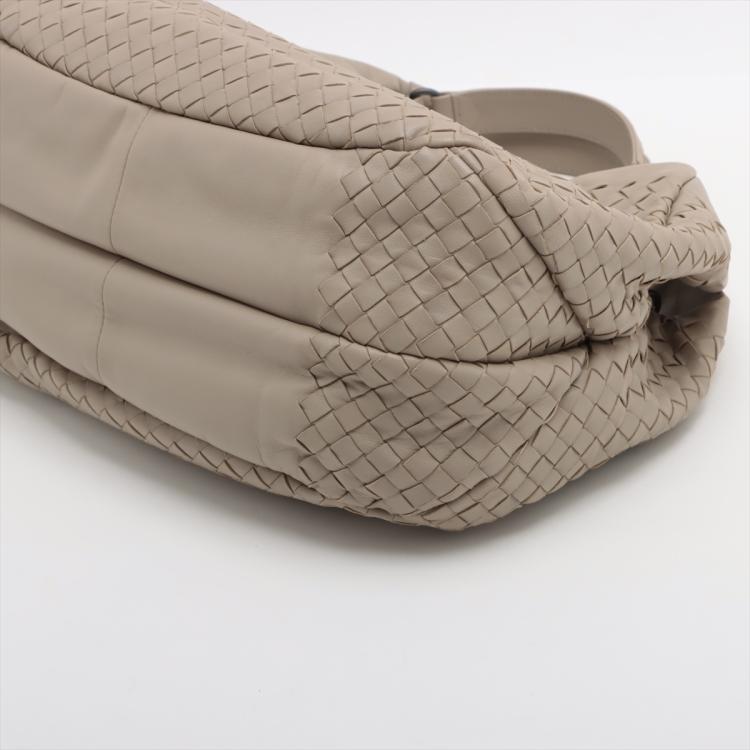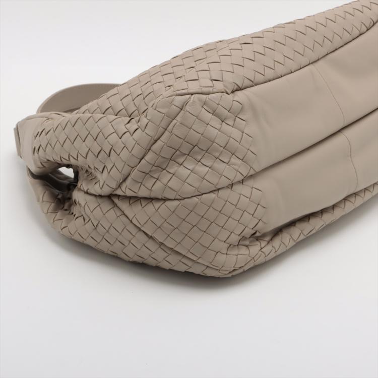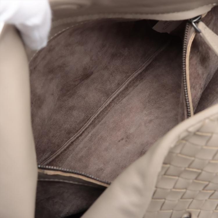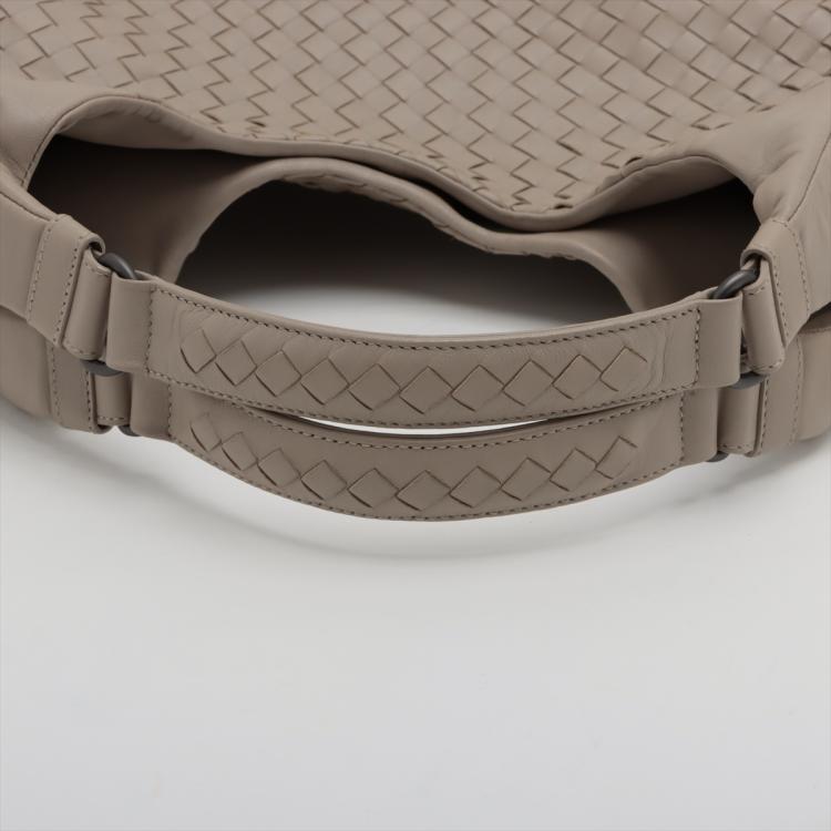 Bottega Veneta Campana hobo in light grey Intrecciato Nappa leather. Featuring gun metal- toned hardware, open top with magnetic button closure. The top opens to a suede-like lining interior with a zipper pocket. Approximate dimensions: 33cm(L) x 28cm(H) x 16.5cm(D), 18cm handle drop. Accompanied by a mirror, BV info cards and a dust bag. With Entrupy Certificate of Authenticity. (Pre-owned)