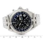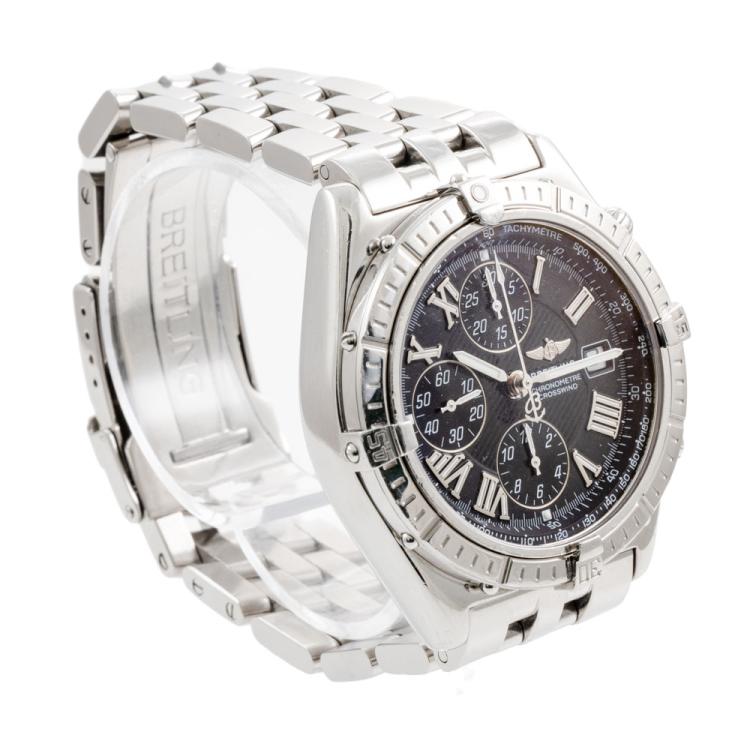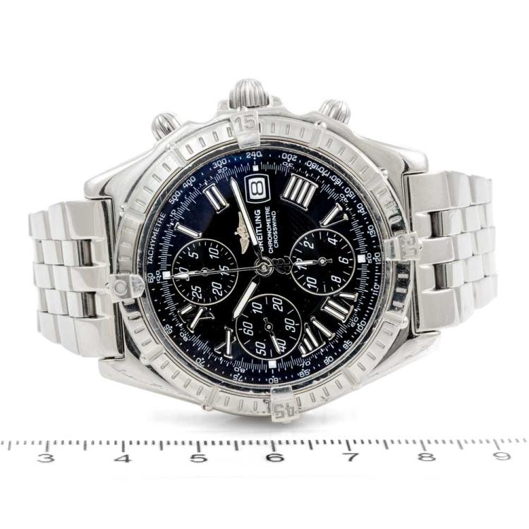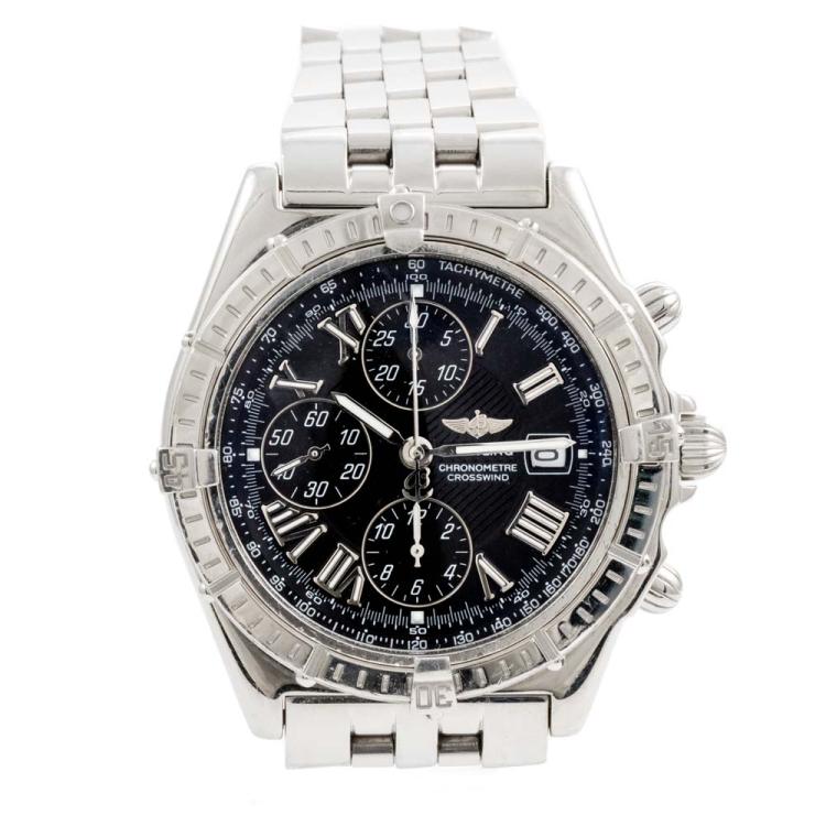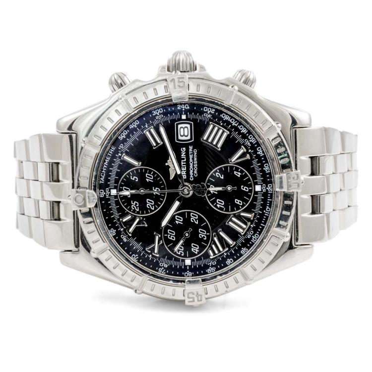 Breitling Crosswind stainless steel automatic mens watch. Black chronograph dial, date, case diameter: 43mm, wrist size: 18.5cm, Swiss made. Ref# A13355. With Breitling stainless steel bracelet and clasp. With Certificate of Authenticity, Breitling International Warranty booklet dated 28/08/2000 and Breitling box. 3 month FSA warranty (Pre-owned)