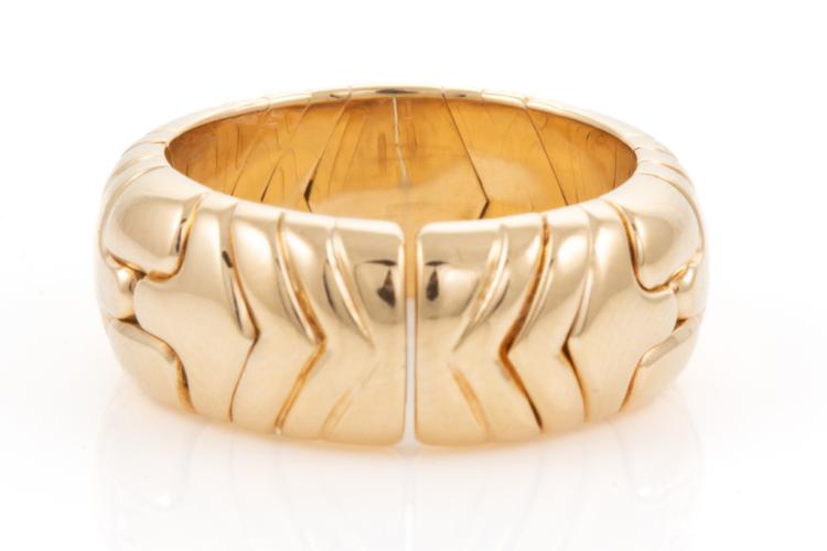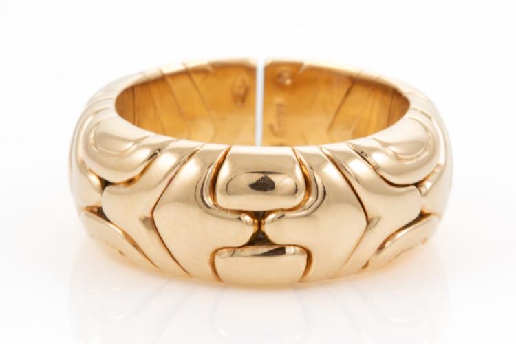 Bvlgari Alveare Gold ring. A geometric flexible Alveare ring band. 18ct yellow gold and stainless steel. Ring size N - ring resizing is not recommended. Weight: 13.5g. Band width: 8.5mm. Circa 1989. With Bvlgari box. With Certificate #417664 (Pre-owned)