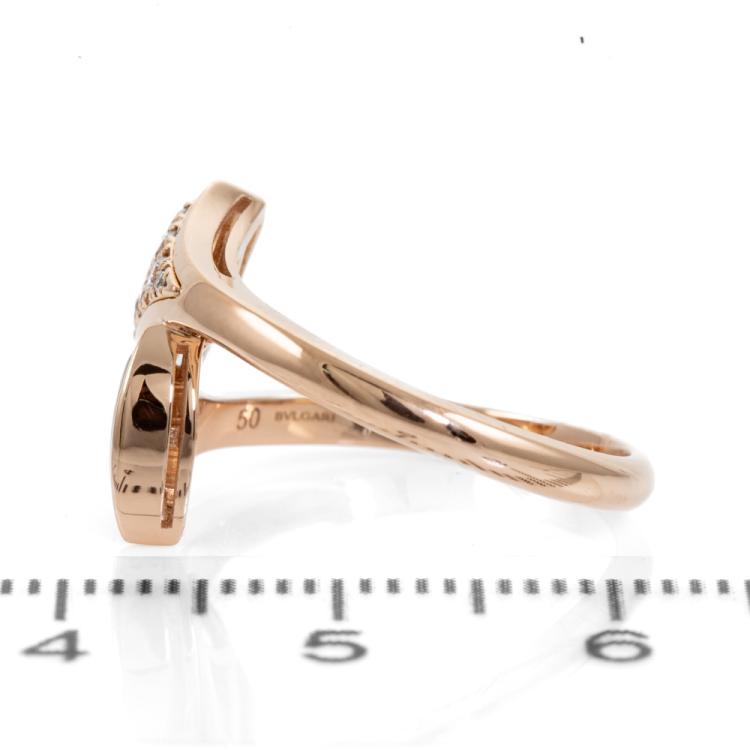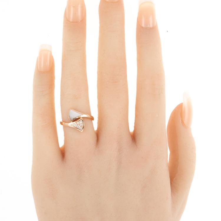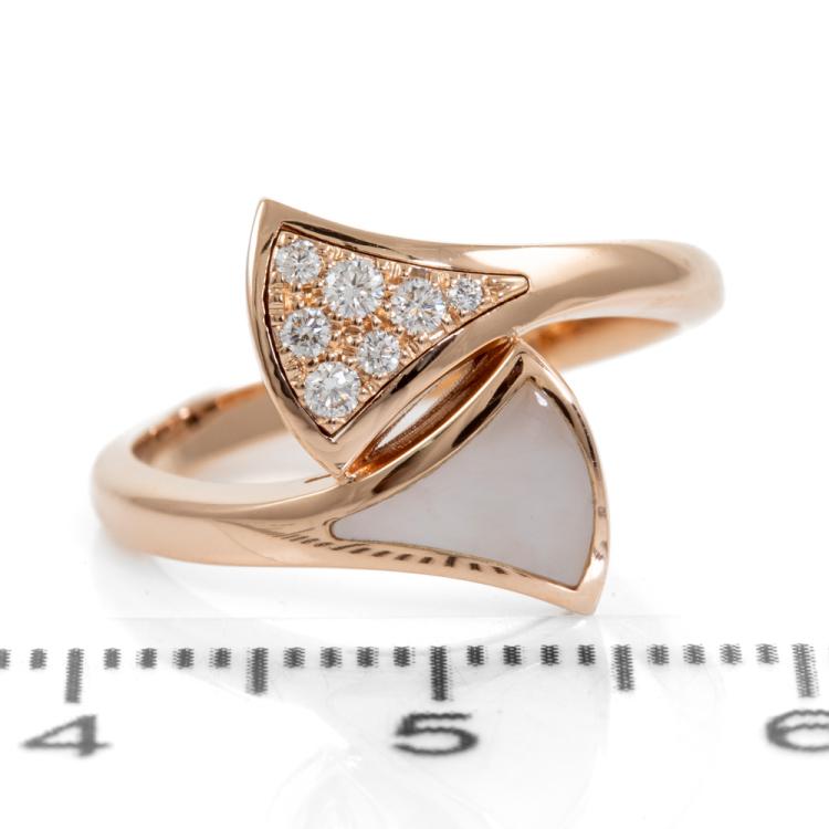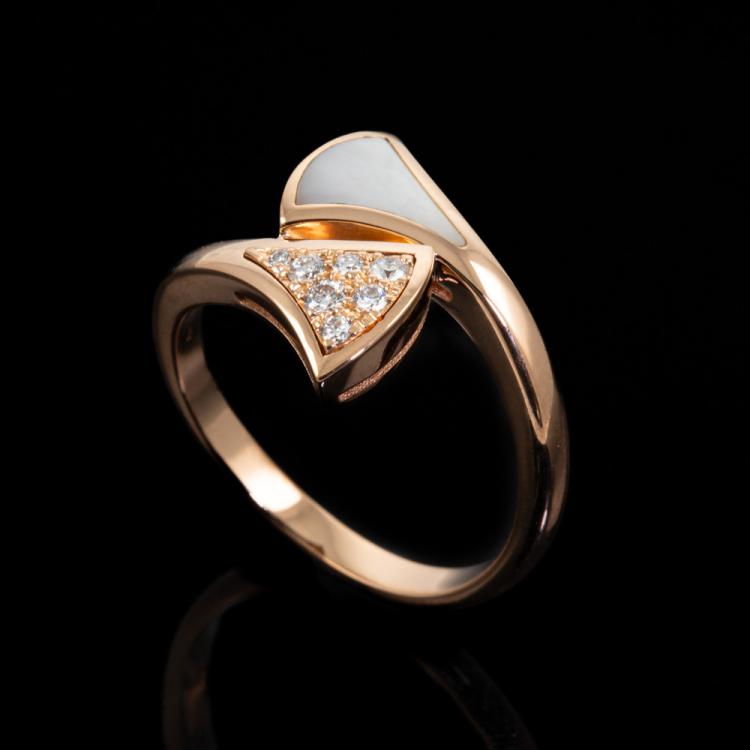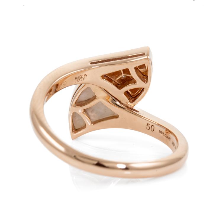 Bvlgari Diva Dream ring with Mother of Pearl and Diamonds totalling 0.10cts. Made in Italy. 18ct rose gold. Stamped size 50, - ring resizing is not recommended. Weight: 3.7g. (Pre-owned)
