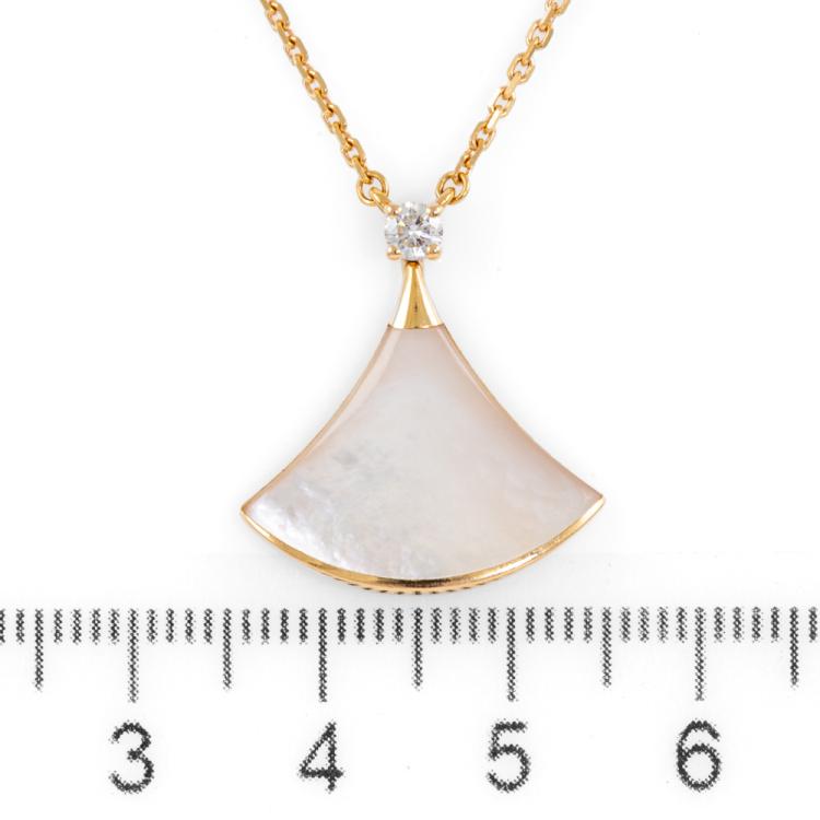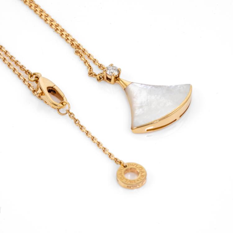 Bvlgari Divas Dream Necklace with white Mother of Pearl (note minor surface wear) a round Diamond of approximately 0.10ct. Motif size 21mm x 19.3mm. 18ct yellow gold with 18ct yellow gold adjustable Bvlgari 41cm chain. Made in Italy. Weight: 5.5g. (Pre-owned)