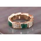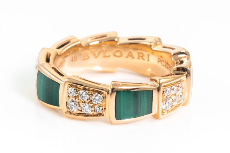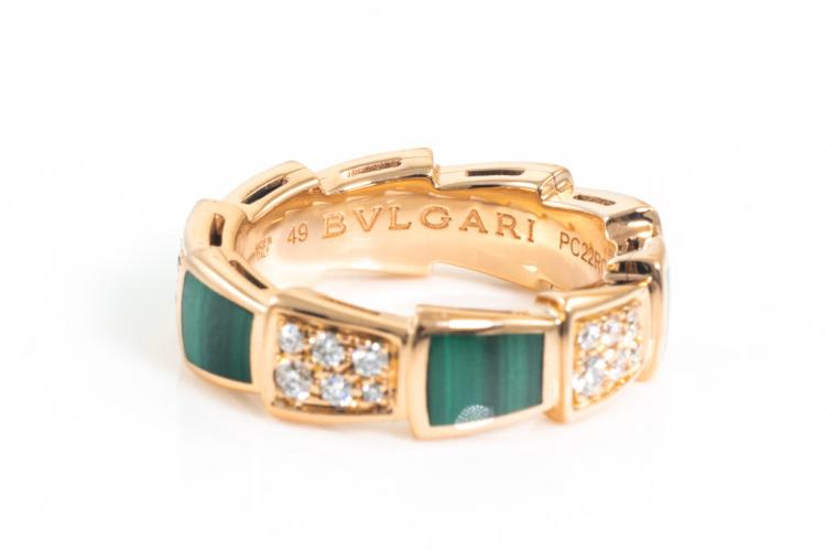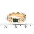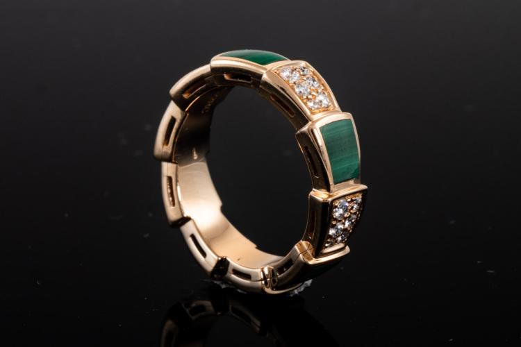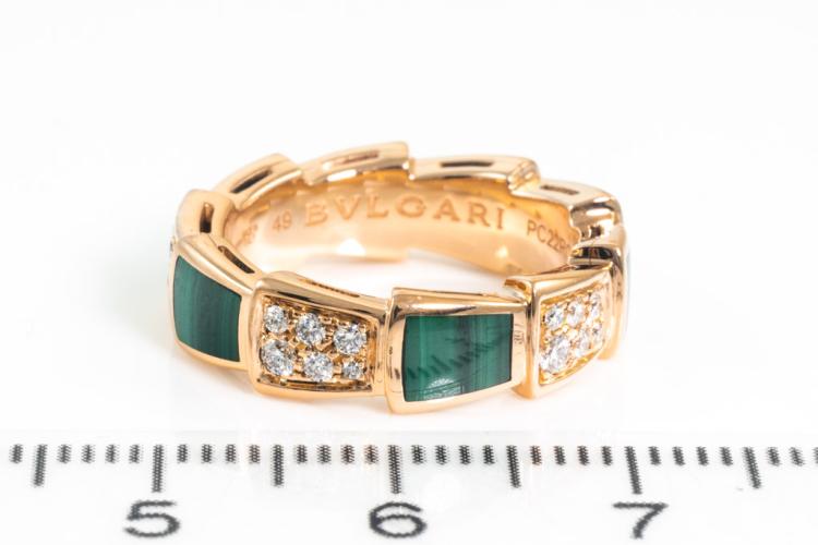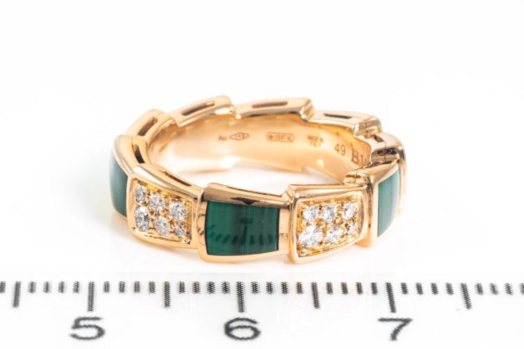 Bvlgari Serpenti Viper ring with Malachite and round Diamonds totalling 0.34cts (Estimated grading: F-G VS). 18ct rose gold. Made in Italy. Bvlgari stamped size 49, I1/2 - ring resizing is not recommended. With Certificate #416845. Weight: 6.1g (Pre-owned)