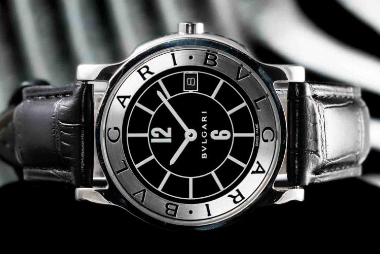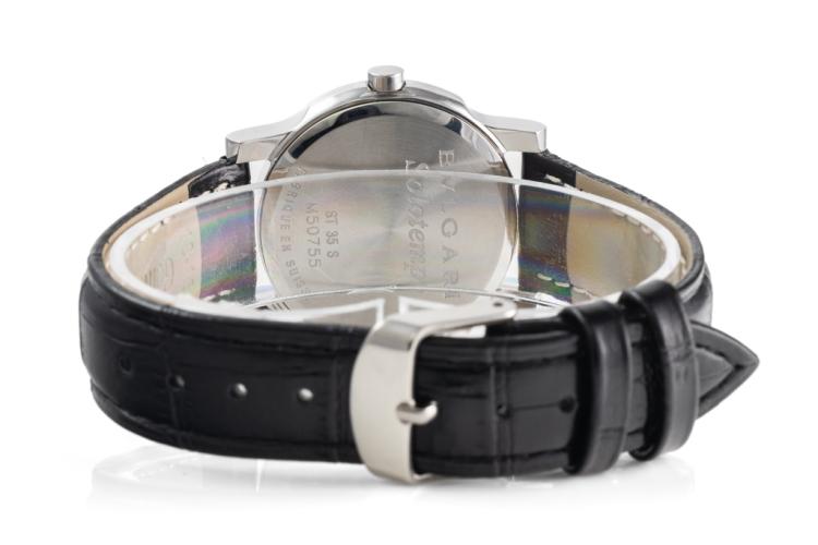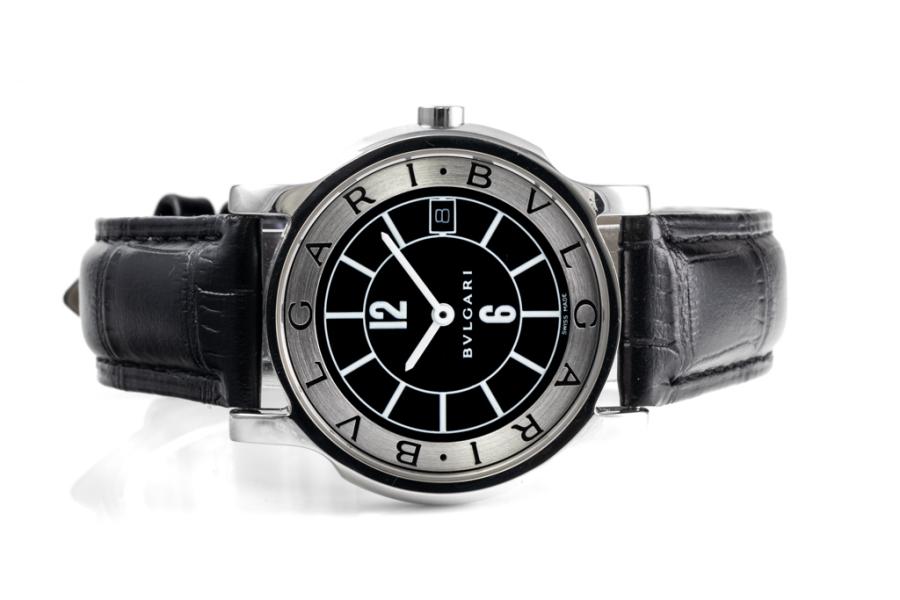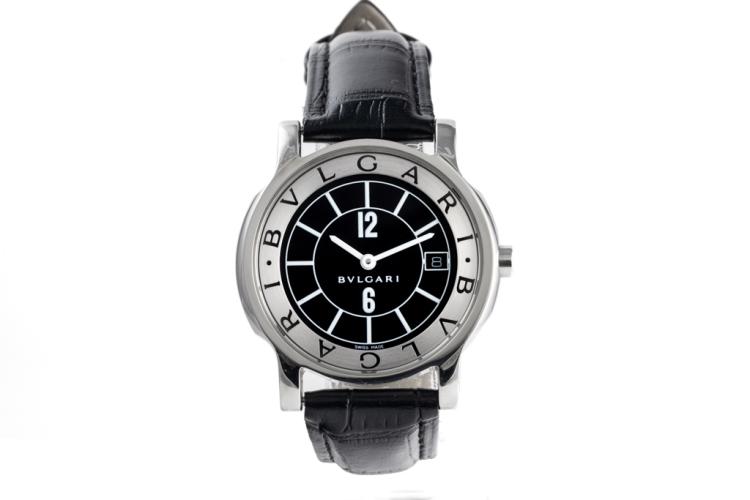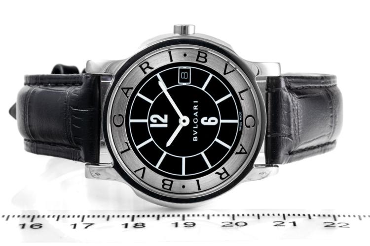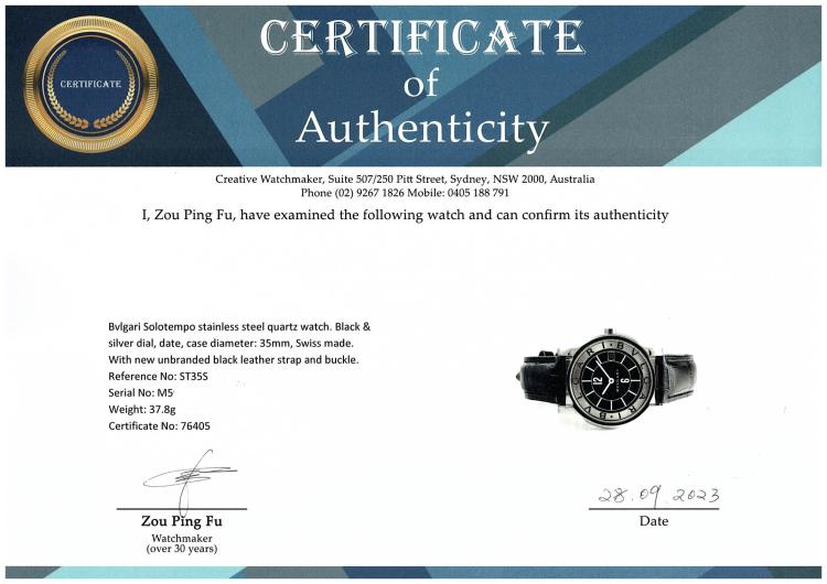 Bvlgari Solotempo stainless steel quartz watch. Black & silver dial, date, case diameter: 35mm, strap length: 21cm, Swiss made. Ref# ST35S. With new unbranded black leather strap and buckle. With Certificate of Authenticity. 3 month FSA warranty. (Pre-owned)
