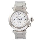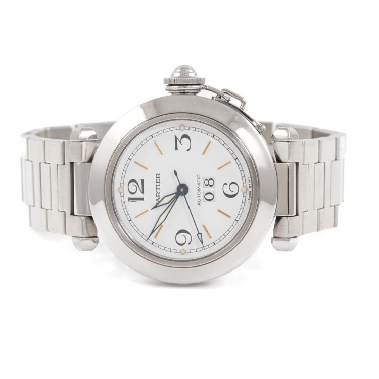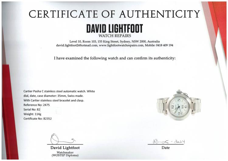Cartier Pasha C stainless steel automatic watch. White dial, date, case diameter: 35mm, wrist size: 17cm, Swiss made. Ref# 2475. With Cartier stainless steel bracelet and clasp. With Certificate of Authenticity, Cartier Certificate booklet dated 16/7/2000, Cartier cleaning kit and Cartier box. 3 month FSA warranty. (Pre-owned)