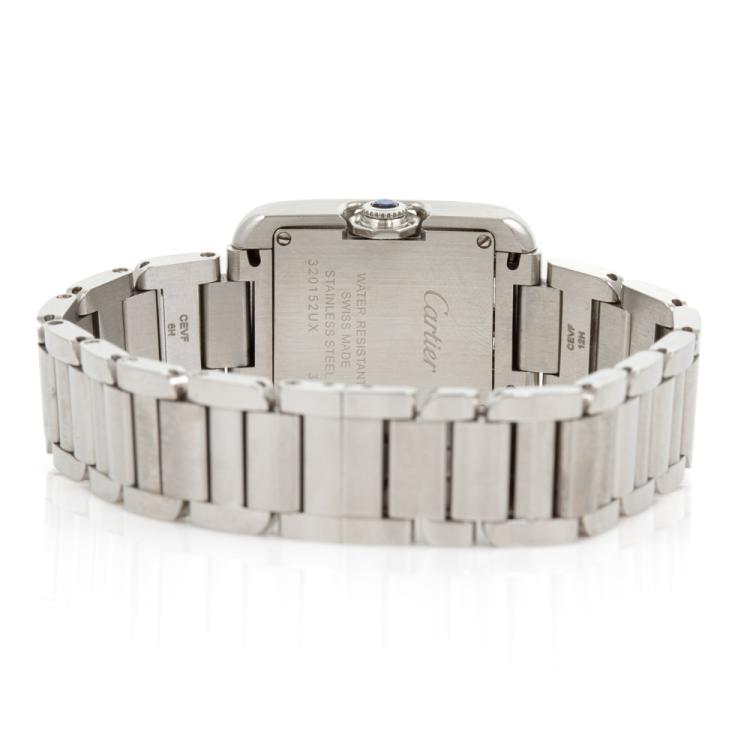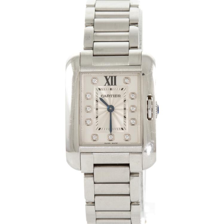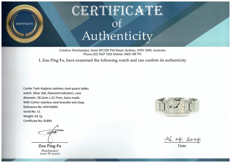 Cartier Tank Anglaise stainless steel quartz ladies watch. Silver dial, Diamond indicators, case diameter: 30.2mm x 22.7mm,wrist size: 16cm, Swiss made. Ref# W4TA0003. With Cartier stainless steel bracelet and clasp. With Certificate of Authenticity, Undated Cartier Certificate booklet and Cartier box. 3 month FSA warranty (Pre-owned)