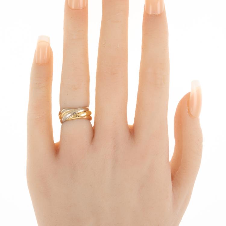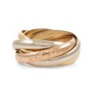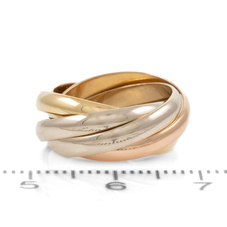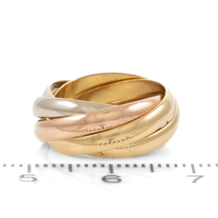 Cartier trinity 5-strand ring. 18ct yellow, rose and white gold. Cartier stamped size 46, actual size E - ring resizing is not recommended. Width of each band: 2.6mm. Weight: 7.2g. (Pre-owned)