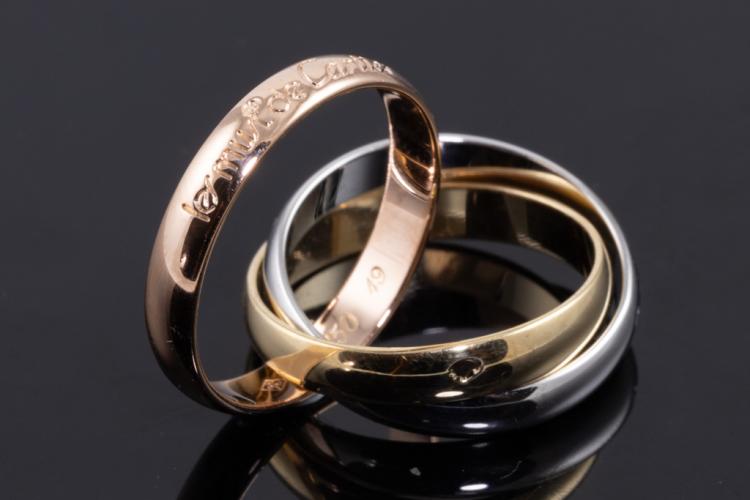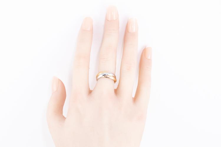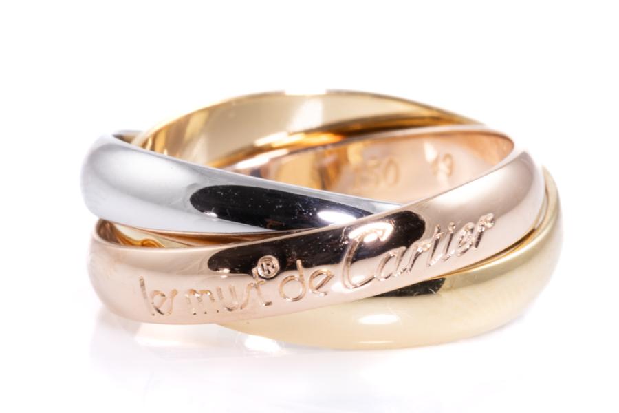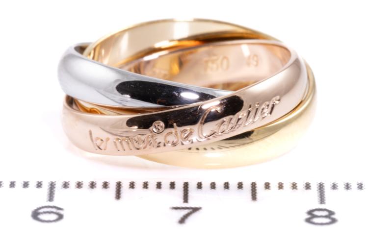 Cartier trinity ring. 18ct yellow, rose and white gold. Cartier stamped size 49, J1/2 - ring resizing is not recommended. Width: 3.2mm. Weight: 7.1g. (Pre-owned)