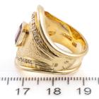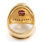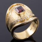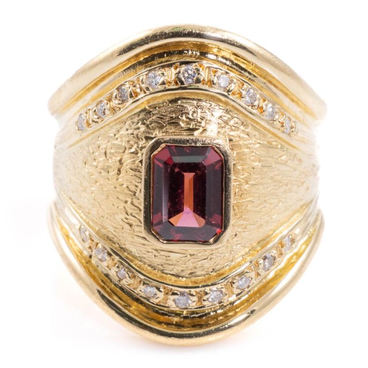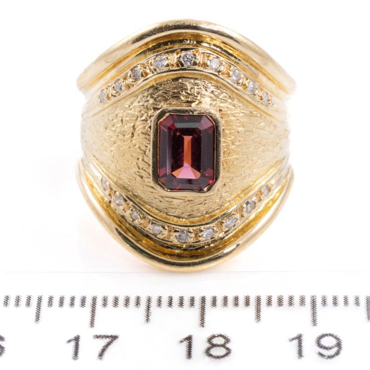 Cerrone Garnet and Diamond ring with emerald cut red Natural Garnet of approximate 1.00ct and round Diamonds totalling 18ct. 18ct yellow gold. Ring size: N. Band width: 9.3mm - 7.9mm. Weight: 15.7g. (Pre-Owned)