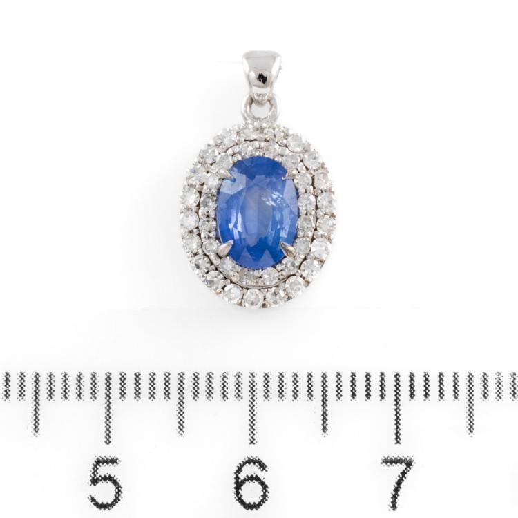 Sapphire and Diamond pendant with an oval shape Ceylon natural blue Sapphire of 1.07ct and round natural Diamonds totalling 0.51ct (Estimated grading: G VS-SI). 14ct white gold. No chain provided. Weight: 1.7g. With GGTL Report #209464. (As new)