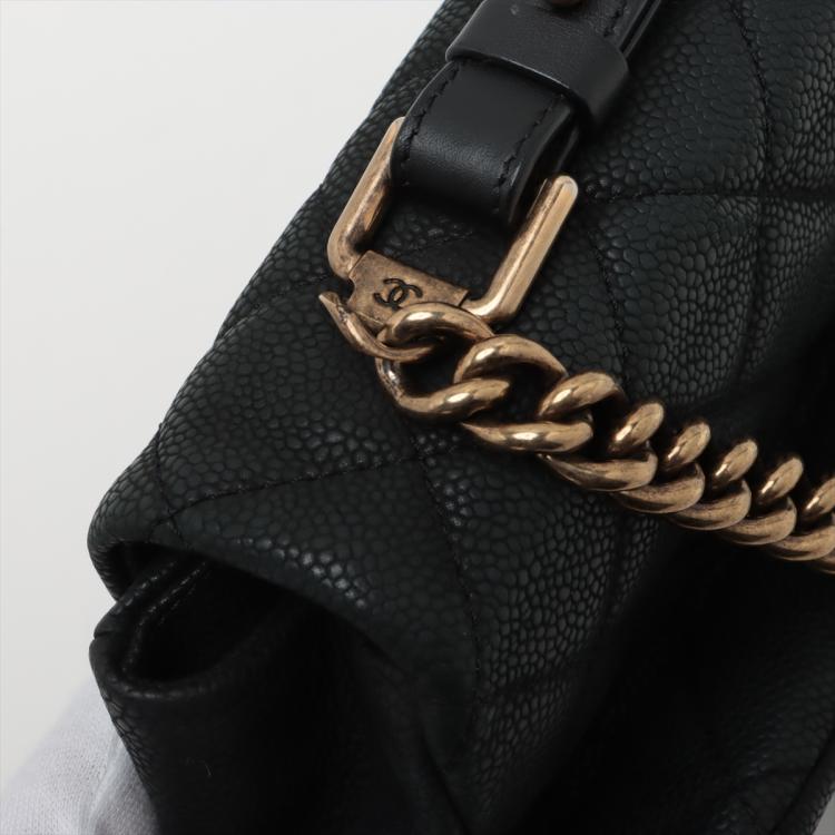 Chanel globe trotter flap bag in black matelasse caviar skin. Featuring a single flat leather handle, antiqued gold-tone hardware. The signature CC turn-lock opens to a black fabric interior with patch and zipper pockets. Approximate dimensions: 26cm(L) x 14cm(H) x 8.5cm(D), handle drop 6cm, strap drop 60.5cm. Accompanied by a Chanel dustbag. Accompanied by a Chanel dust bag. With Australia Luxury Authentication Certificate. (Pre-owned)